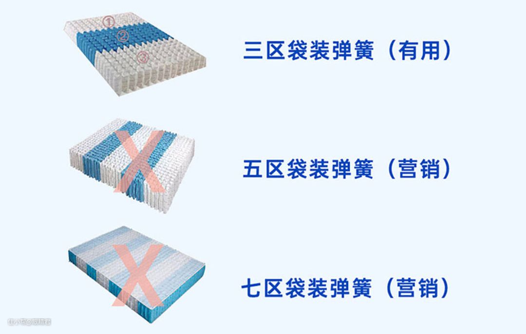 除了软硬度差异,分区弹簧是这几年比较流行的宣传重点,也是床垫值得考虑的一个功能点,很多床垫都在宣传三分区、五分区,甚至还有七分区的,但实际功能来说,三分区算是比较有实用价值,如果不是根据个人身高体重进行定制,五分区/七分区卖点更多的是营销噱头,毕竟1.6米身高和1.8米身高的用户,腰位并不在同一个位置。