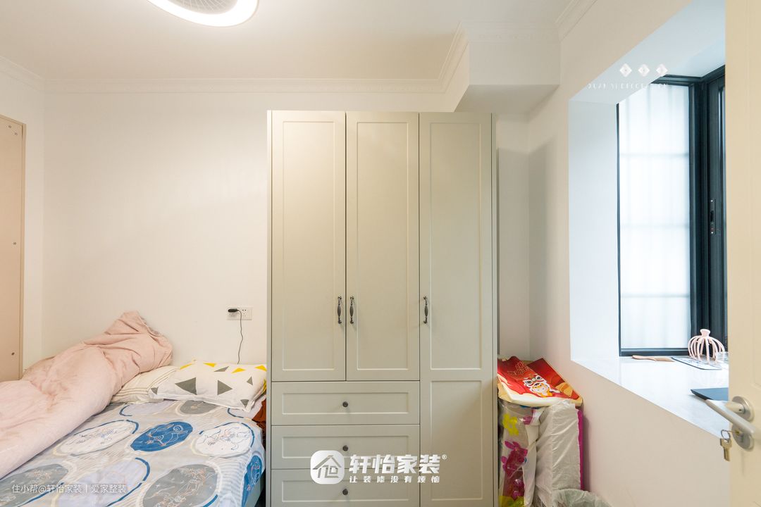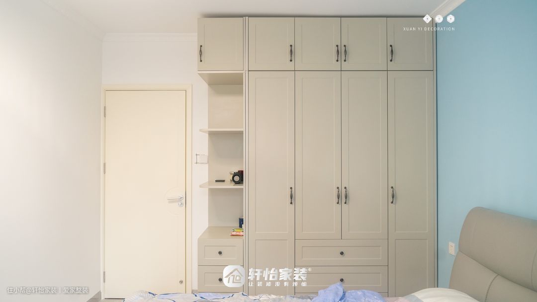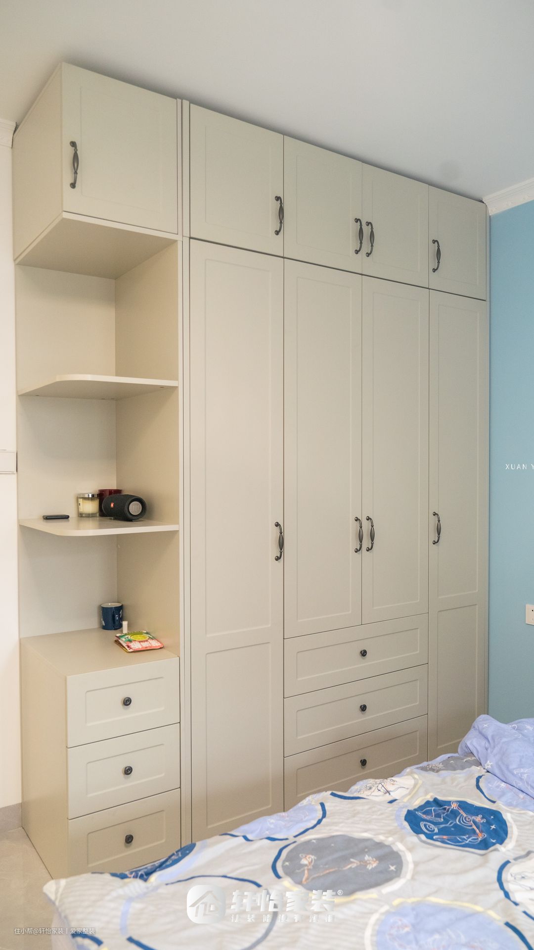 衣柜侧边做开放式置物架,在上面可以摆放一些装饰摆件或者生活用品,补足没有床头柜置物的空间,衣柜分区不仅有挂放大衣的地方,也在柜子下做多个抽屉,存放一些贴身衣物,这样坐在床上也能轻松拿到衣物。