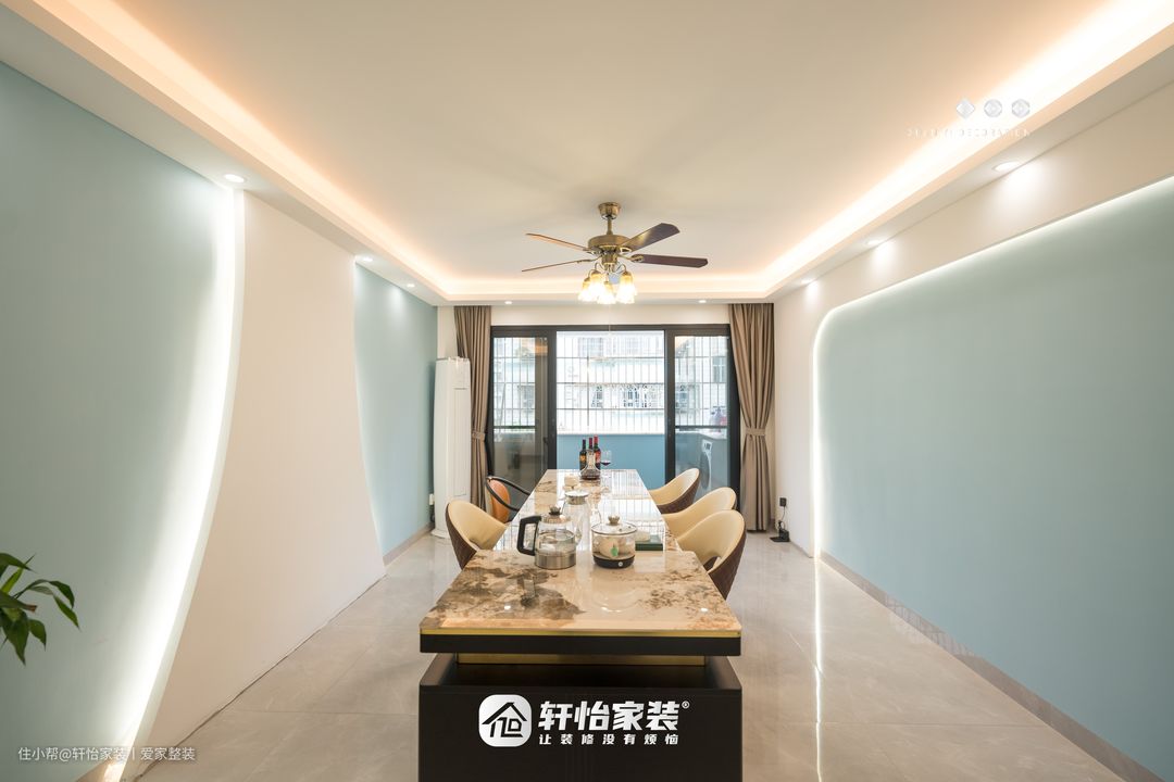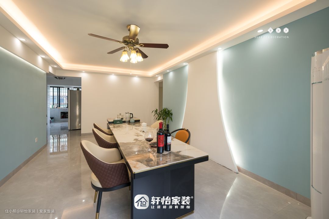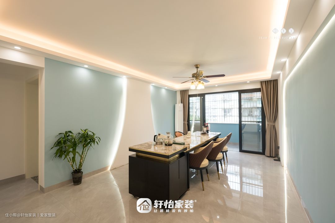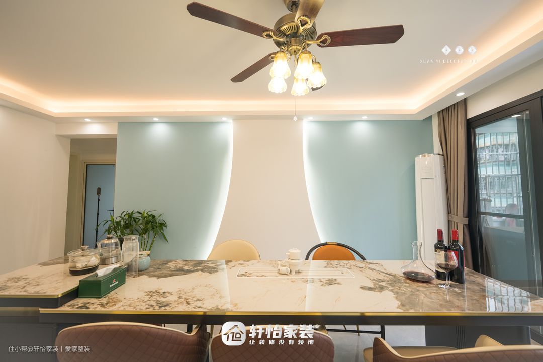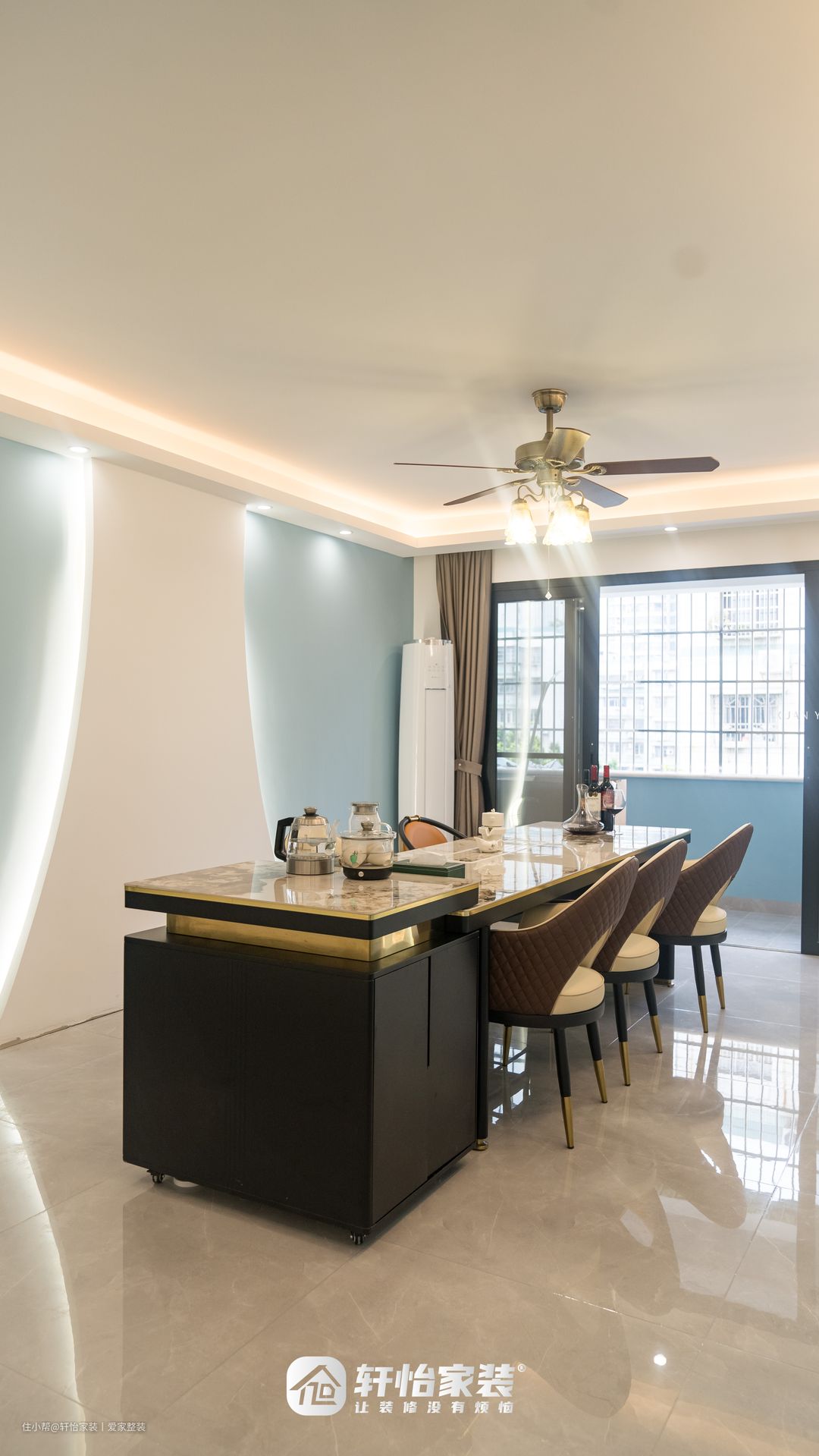 茶桌选取大理石桌板搭配金色边框,用黑色桌脚去压制奢华感,选用大理石桌板也是考虑到南方城市潮湿,大理石特点不怕水,不易出现划痕,易清洗,有质感。不仅适用于喝茶,也可以当成餐桌,使整体空间协调,采用风扇吊灯也是考虑到家里有长辈,不适合经常吹空调。