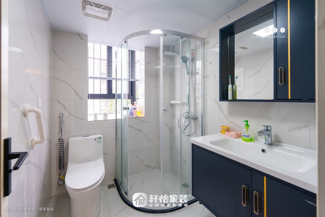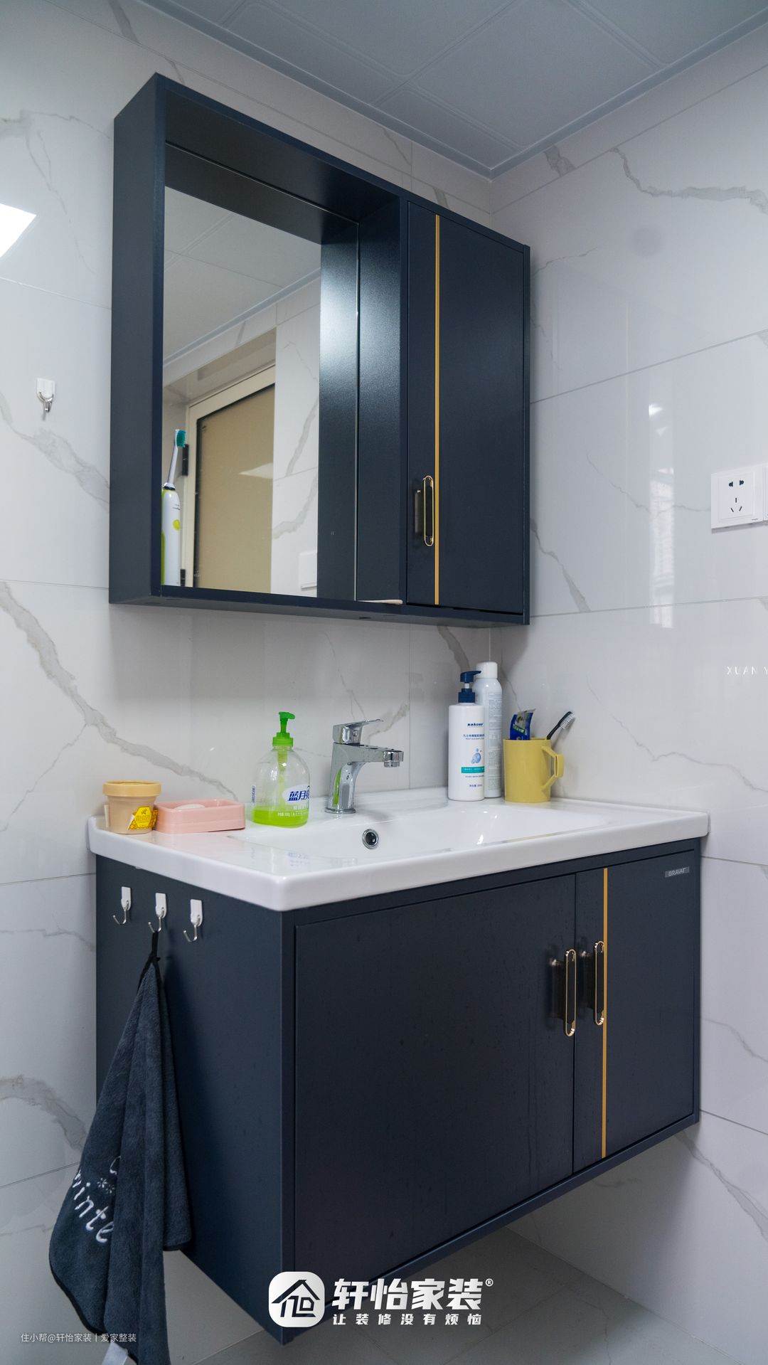 卫生间面积小也不影响做成干湿分离的结构,墙壁上安装的扶手考虑到家里有老人如厕不方便的情况,最妙的地方在于分割窗户的环形玻璃门,将窗台一分为二,一边放置洗护用品,一边放置卫生用品,同时玻璃门也隔绝浴室的水汽润湿卫生纸的情况,镜子和收纳成一体,这样不仅内嵌的洗手台面能置物,镜子旁边的收纳柜和镜子面前的架子也能减少台面放置的洗漱用品数量,使台面更加干净整洁。