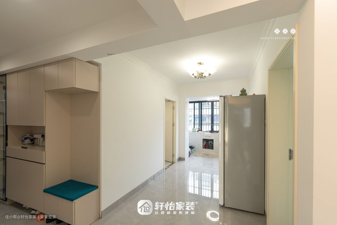 玄关采用通顶打造玄关柜,收纳能力大大升级,置物区,衣帽区,换鞋凳,鞋柜,全身镜一应俱全,出门拿包,换鞋,穿衣,随手储物一气呵成,把储物间和衣帽间的压力分散部分到玄关,大大减少室内的收纳压力。换鞋凳和玄关柜融为一体,不用挪移的换鞋凳也变得更加轻松便利。