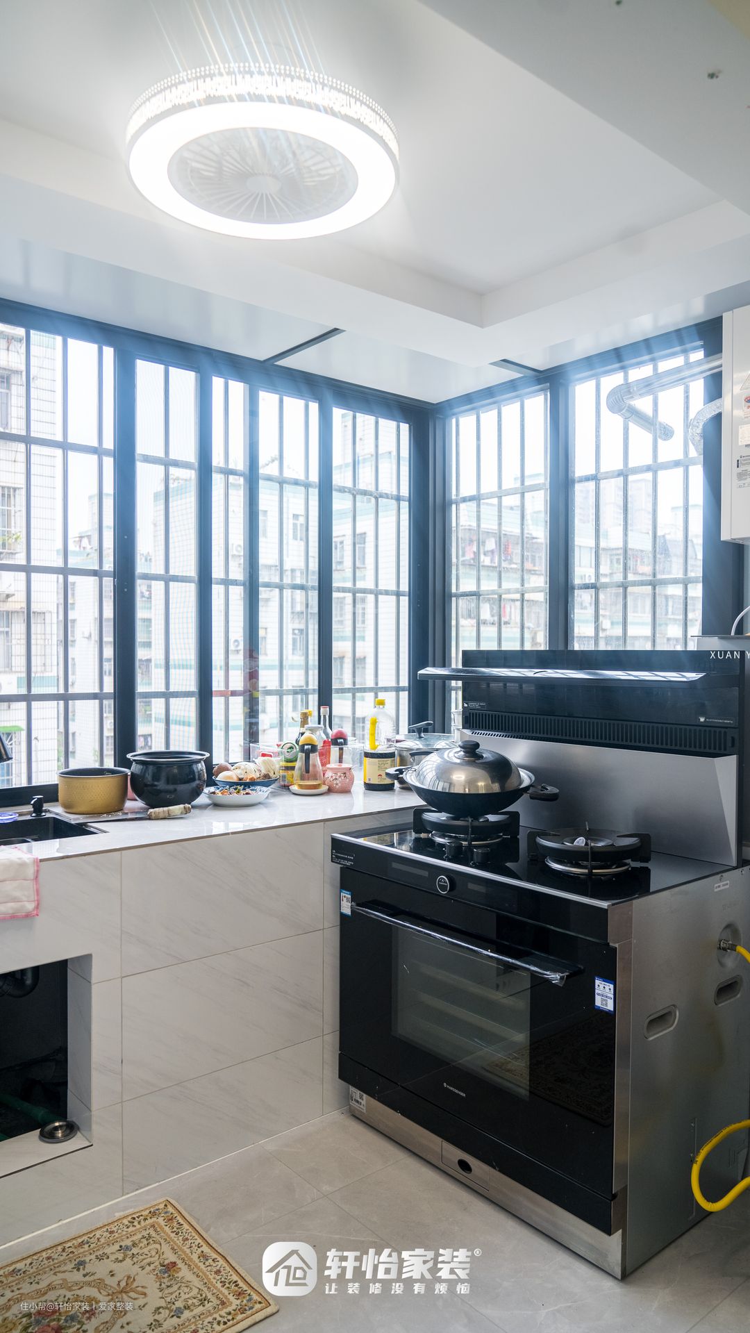 厨房虽然没有采用传统的用门隔档,但是却没有开放式厨房那么大的油烟蔓延,做U型橱柜,更加符合人体工程学,橱柜和地板采用同一个色调的瓷砖,形成呼应,保留原始墙体,在视觉上也更加开阔,空间更大,提升了整体采光。