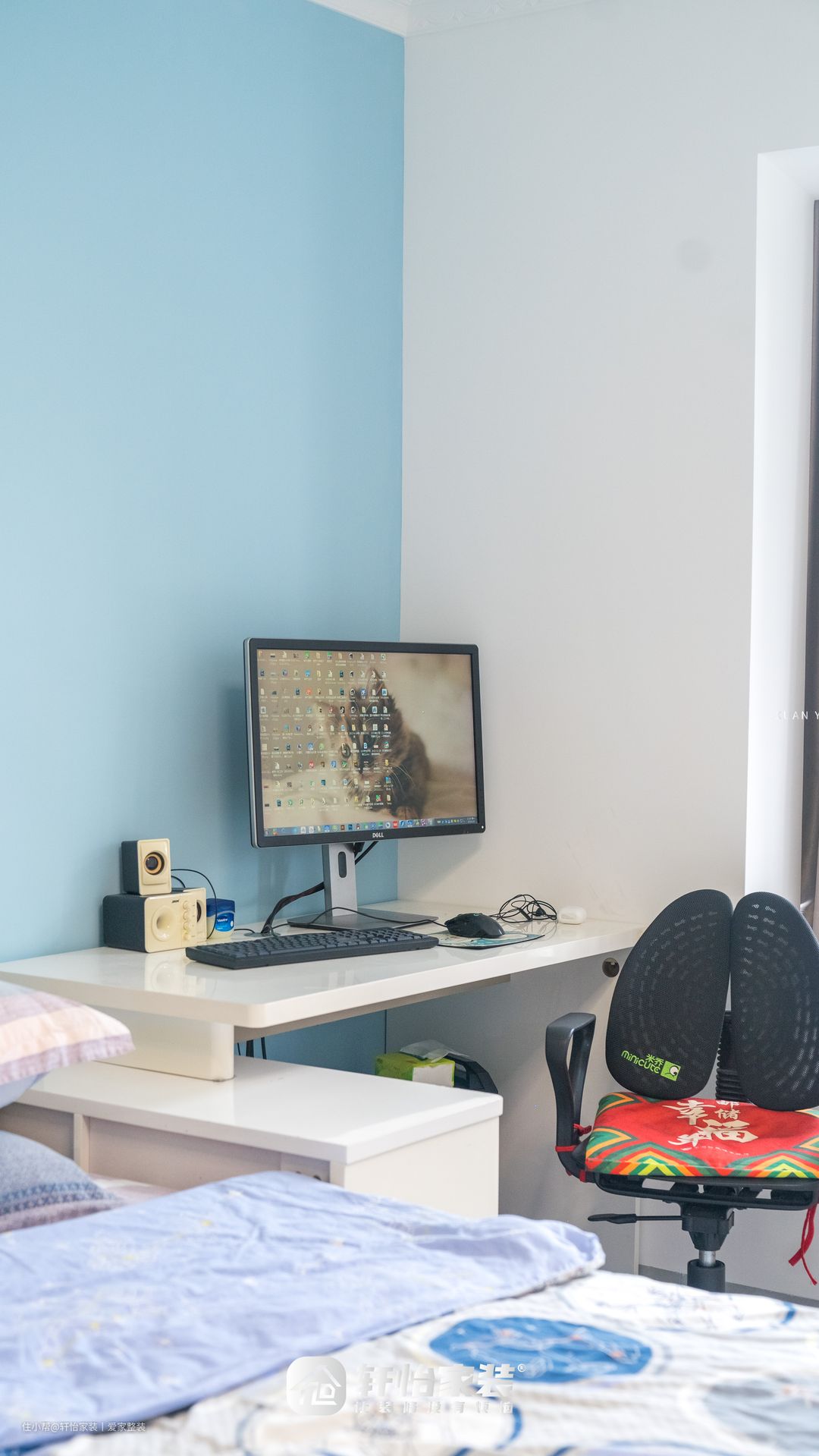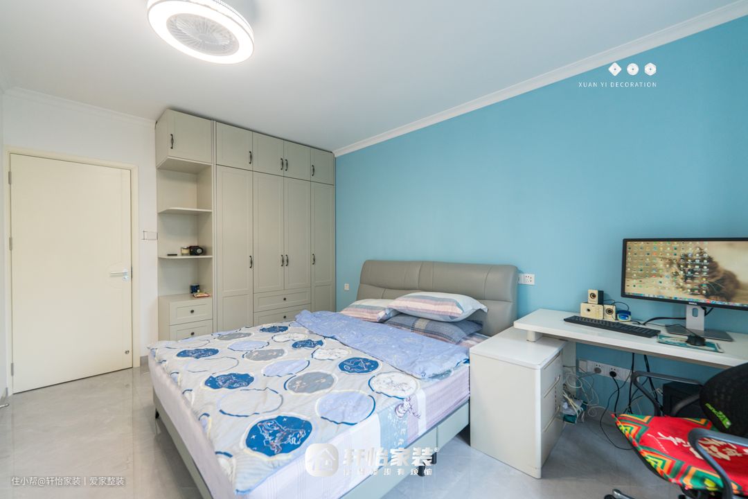 主卧采用和客厅一样的浅蓝色系,房间顶部采用无吊顶主灯设计,空间更加简洁,整体软装设施采用米色和白色打造轻盈感,取消单独的床头柜设计,让床头柜成为电脑桌的一部分,实用又不会突兀。