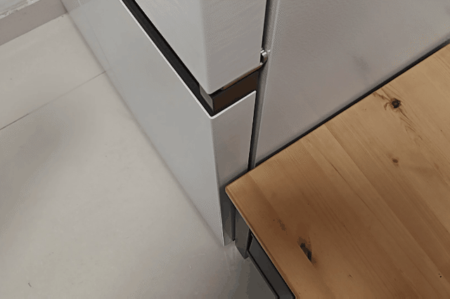 对比看看TCL T9冰箱和普通冰箱之间的铰链区别。TCL T9冰箱采用平稳嵌入式铰链设计,可以实现贴墙放置的同时冰箱门能正常开关。普通冰箱开合需要占用一定的外部空间,预留空间后无法实现贴墙放置。对比来看,采用平稳嵌入式铰链设计的TCL T9冰箱优势十分明显。
