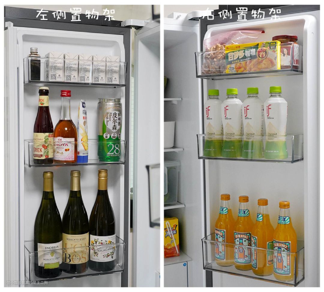 左右两侧都设计有置物架,置物架分成上中下三层。从上到下的收纳高度以此增加,方便存放不同的物品。上层和中层高度相对较低,可以存放一些调料、听装饮料和其他高度较低的物品。底层高度相对较高,可以放一些大瓶饮料、酒水。二狗是小甜水爱好者,夏天的话底层自然是塞满小甜水咯。