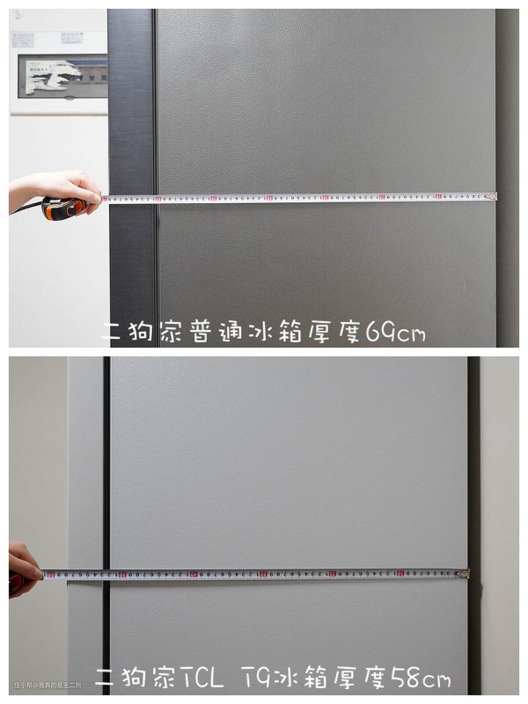 要实现嵌入式美观,还有一点是冰箱不能突出。目前橱柜和其他柜体,很多进深都在600mm。想要保证嵌入不突出,那么冰箱+冰箱插座的厚度自然是不能超过600mm的,这样才能确保美观度。TCL T9冰箱采用了580mm的厚度设计,能够轻松满足绝大部分家居场景的嵌入需求。对比二狗家里普通冰箱的690mm厚度,TCL T9冰箱的580mm厚度优势还是很明显的。
