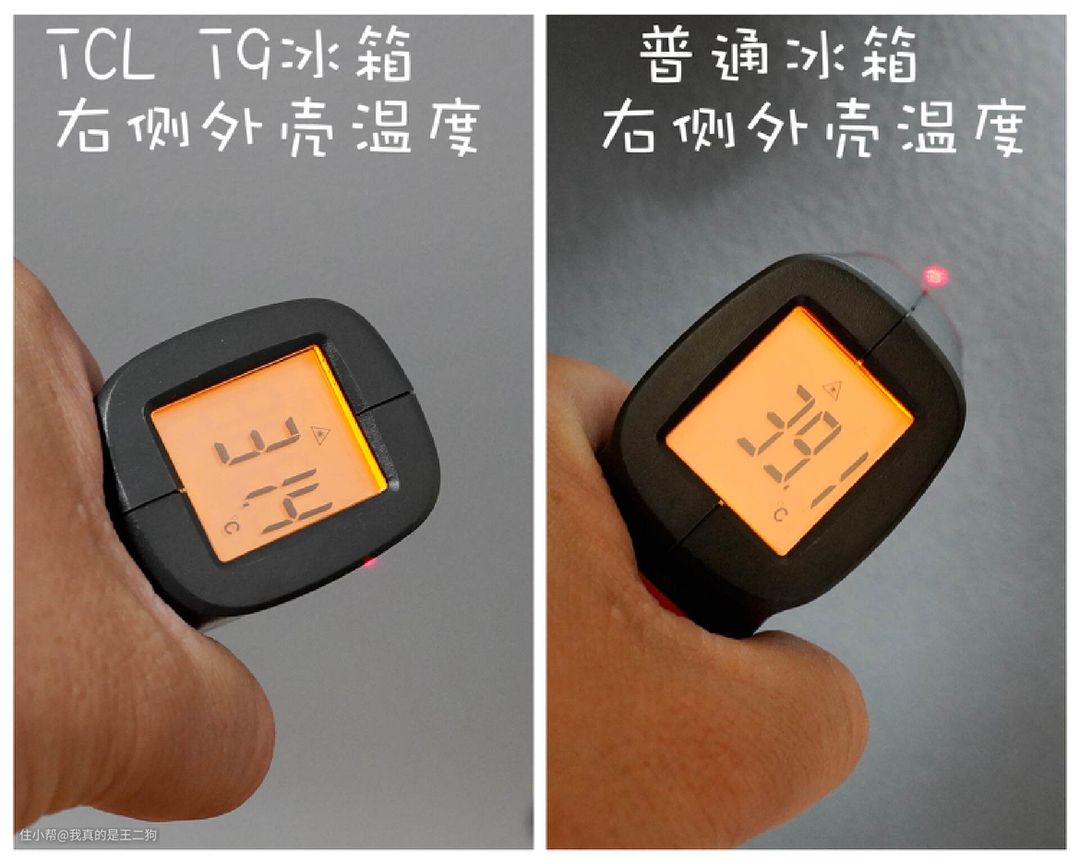 要想实现真正的超薄零嵌,首先需要对冰箱的散热结构进行优化。TCL T9冰箱针对超薄零嵌设计对散热做了专门优化,将散热结构设计在底部靠前位置,两侧只用留出0.4cm的安装距离。这样可以方便进行嵌入式安装的同时确保有效散热。TCL T9的底部散热区域不太容易测量,这里二狗选择测试TCL T9冰箱和普通冰箱的侧面,对比可以发现普通冰箱因为左右两侧散热的原因,整体的外壳测试温度比TCL的高出不少。