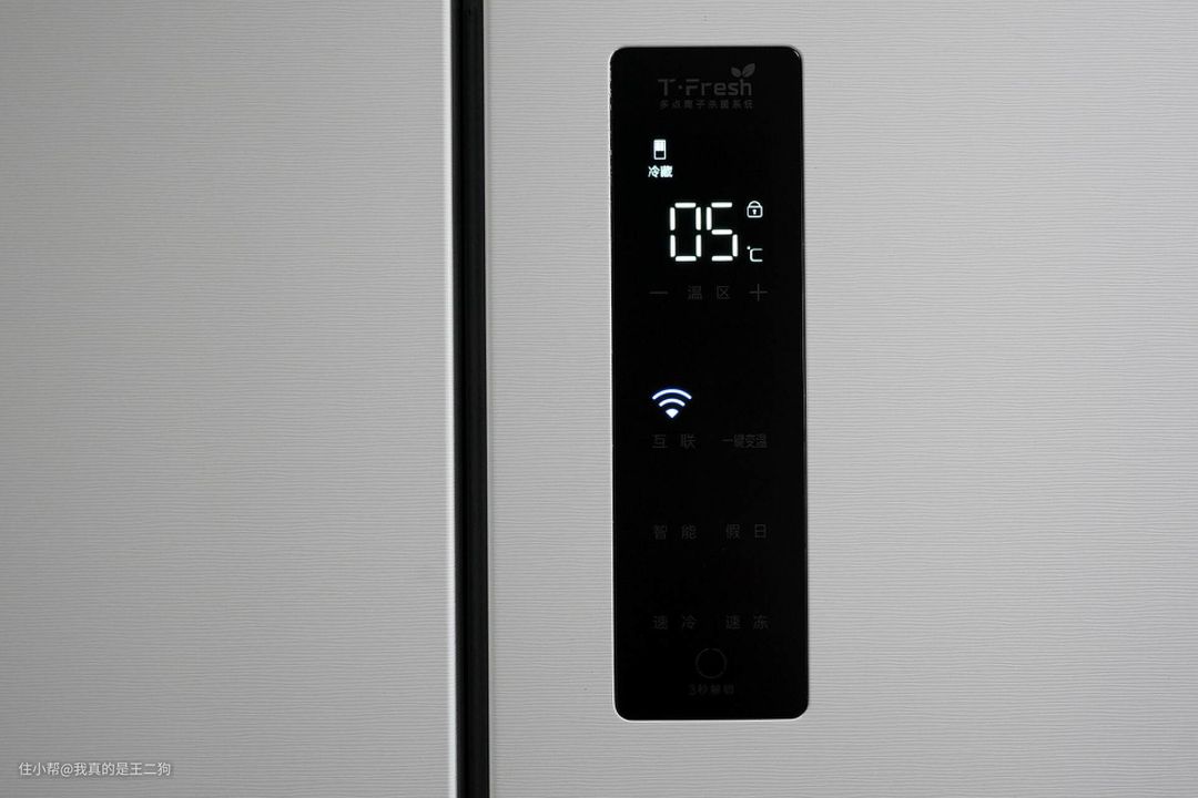 TCL T9冰箱的尺寸并不大,但是内部空间却并不小。得益于采用了第四代微孔发泡技术,通过降低发泡层厚度来有效提升有效容积。冰箱总容积455L,其中上层冷藏室为310L,下层左侧冷冻室为66L,下层右侧变温室为79L。变温室支持-20°C~5°C共26档温度自由调节,可以方便的根据自己需求切换。对二狗来说,自然是切换成冷冻室咯,这样冷冻室的空间就变成了145L,更多的雪糕、炸鸡、薯条就有了存放的空间。