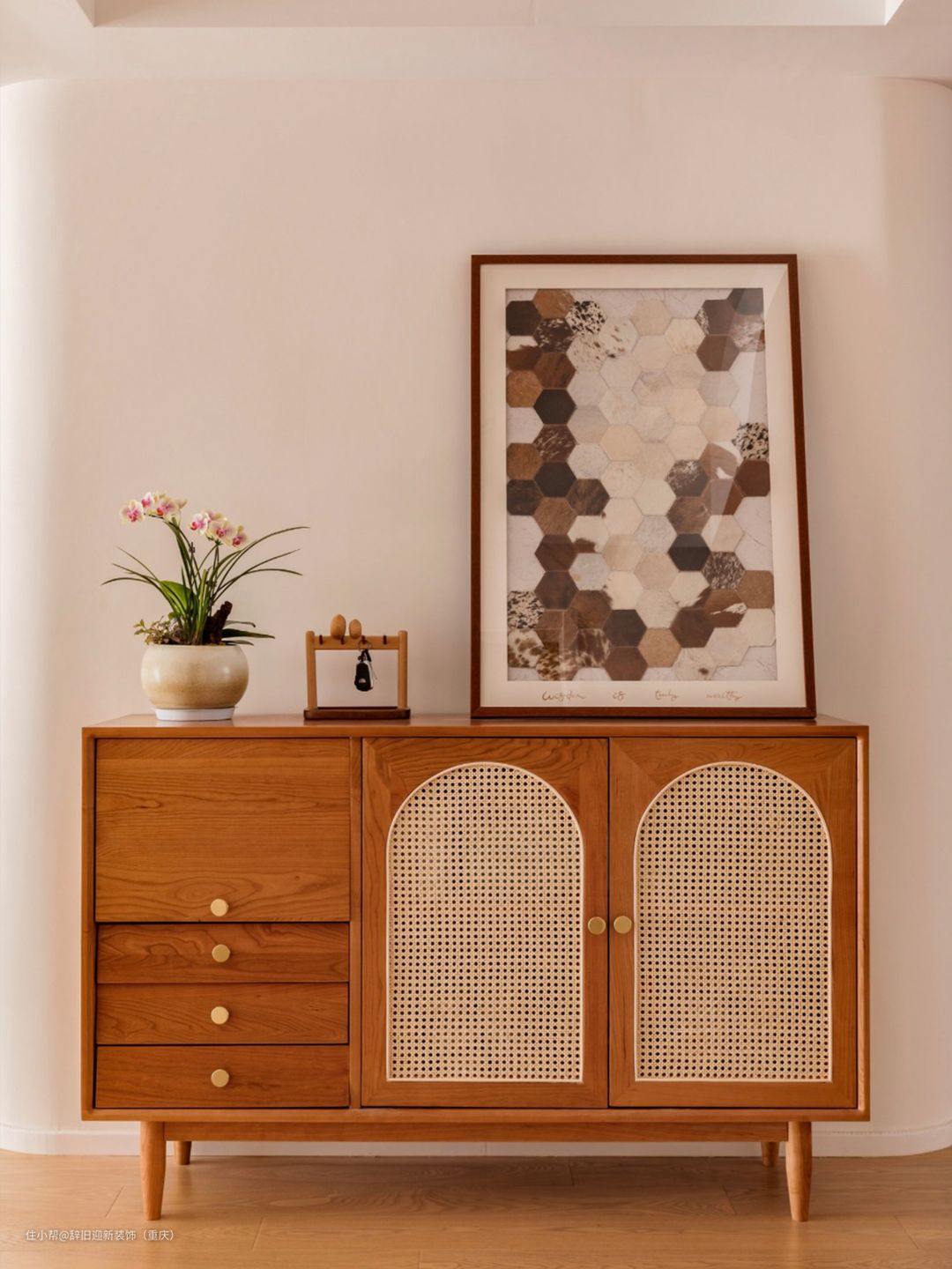 这种收纳桌就特别适合小户型,矮型收纳柜既可以当桌子来使用又可以当摆件台来使用;放些杂物或者小物件既能优化空间,也能起到很好的储物空间。