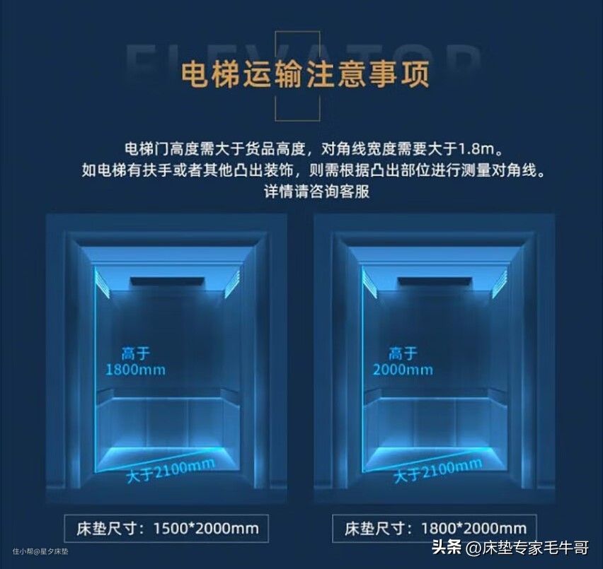 对于高楼层但电梯比较小的客户,在购买床垫前,先要看一下电梯的长宽高。电梯门的高度要比床垫高一些,对角线需长于床垫宽度。如果电梯里还有其他凸出的设计,那需要预留的宽度需要更高一些。