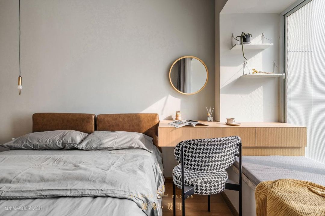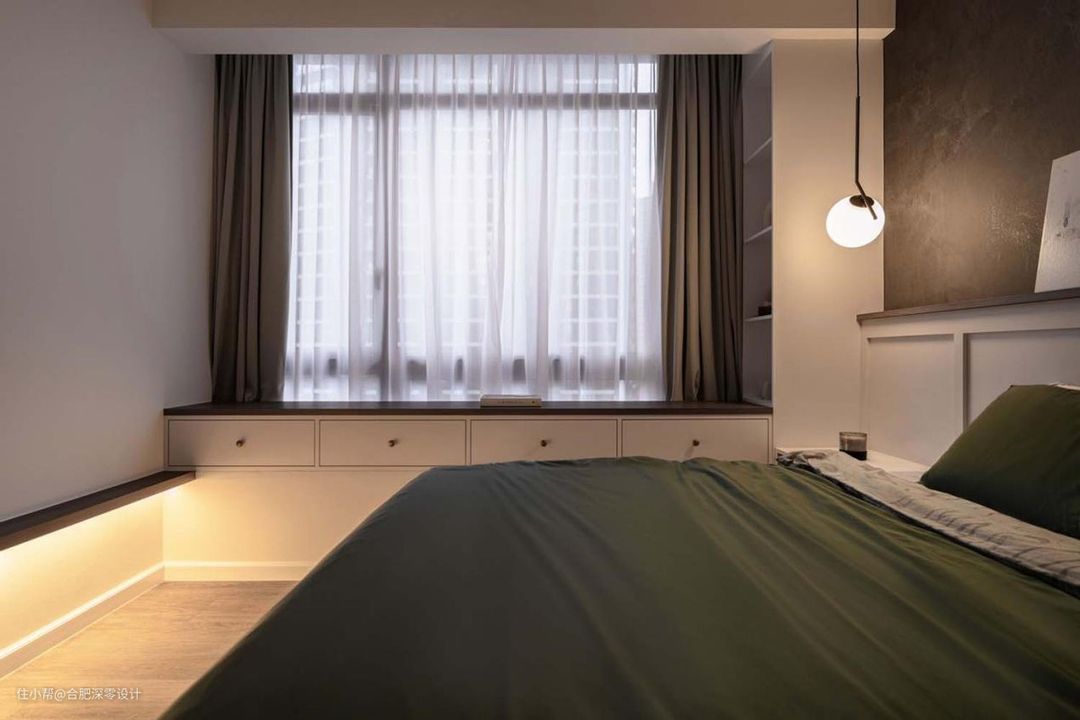 除此之外,如果卧室有飘窗的,咱们也能抖个小机灵,借着飘窗设悬空书桌,做法其实挺简单的,但整个收纳更多,要注意提前确定尺寸和位置,偶尔在飘窗休闲也能随手拿放,但要注意下边角最好处理成弧形,避免磕碰。