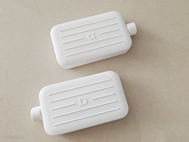 一般自来水的温度大约在14-20°C,水蒸气蒸发毕竟比较慢,因此单纯靠水蒸发加湿降温的力度明显还是不够的,因此米家智能蒸发式冷风扇配备了两个可循环使用冰晶。冰晶盒子里的水平常是液态的,在冰箱里冷冻4个小时后放进水箱里,吹出的风会有更加凉爽一些,这样个人的体验会更好一些。