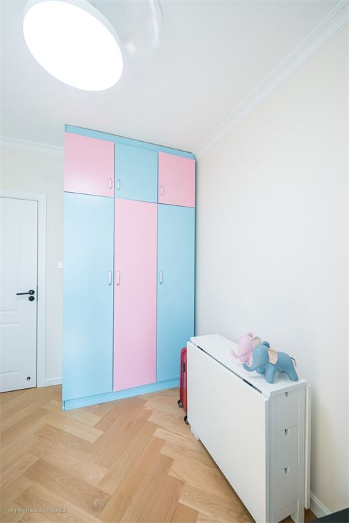 衣柜蓝粉色的搭配,有一点儿童的天真烂漫感,白色折叠床倚墙而立