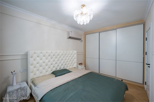 全屋整体风格统一,通铺木地板,刷奶油色油漆,用法式线条点缀墙面,卧室也不例外,高靠背床头,方格拉扣的设计别具一格。搭配吊灯、或浅紫或霁青色家配,更显优雅大气