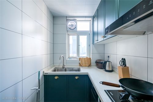 厨房呈L型,动线流畅,采光充足,边洗菜,可以边吹窗外的小风,墙面均采用长方形白色砖铺贴,在墨绿色中留白,更具美感。