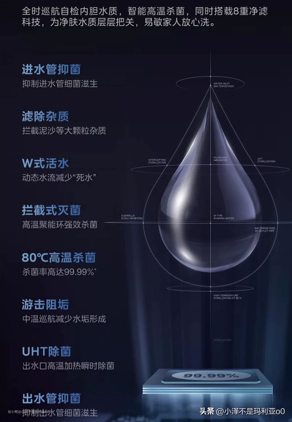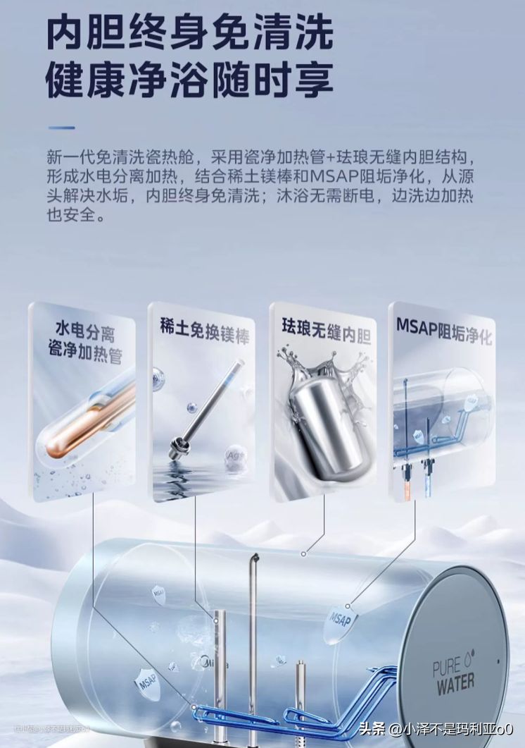 这款的加热管采用了水电分离设计,能够完全隔绝内胆水和加热管,不仅能保障水质洁净,而且也更加安全。再加上内置的MSAP阻垢因子和智能杀菌功能,即使长时间使用,水质也能保持洁净,非常适合皮肤敏感的小仙女~