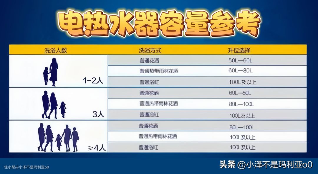 家庭人口数可以作为参考,但不是唯一参考值。如果家里的水压高,平时喜欢使用太阳花洒,或者女生沐浴,1人按照1.5人来计算。三口之家建议买60升以上的,人口多且用水频繁,或者有浴缸需求的可以选80L。