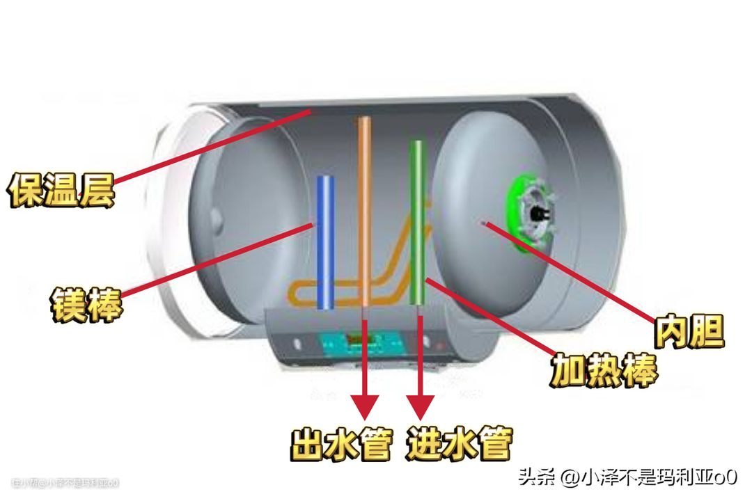 电热水器的原理其实非常简单,你可以把它理解成一个大号的热得快。使用前需要把水先存起来,利用加热棒将可耐压内胆里的水加热到指定温度后,温控部件自动切断电源。它的核心部件主要有内胆、镁棒、加热棒、保温层等。