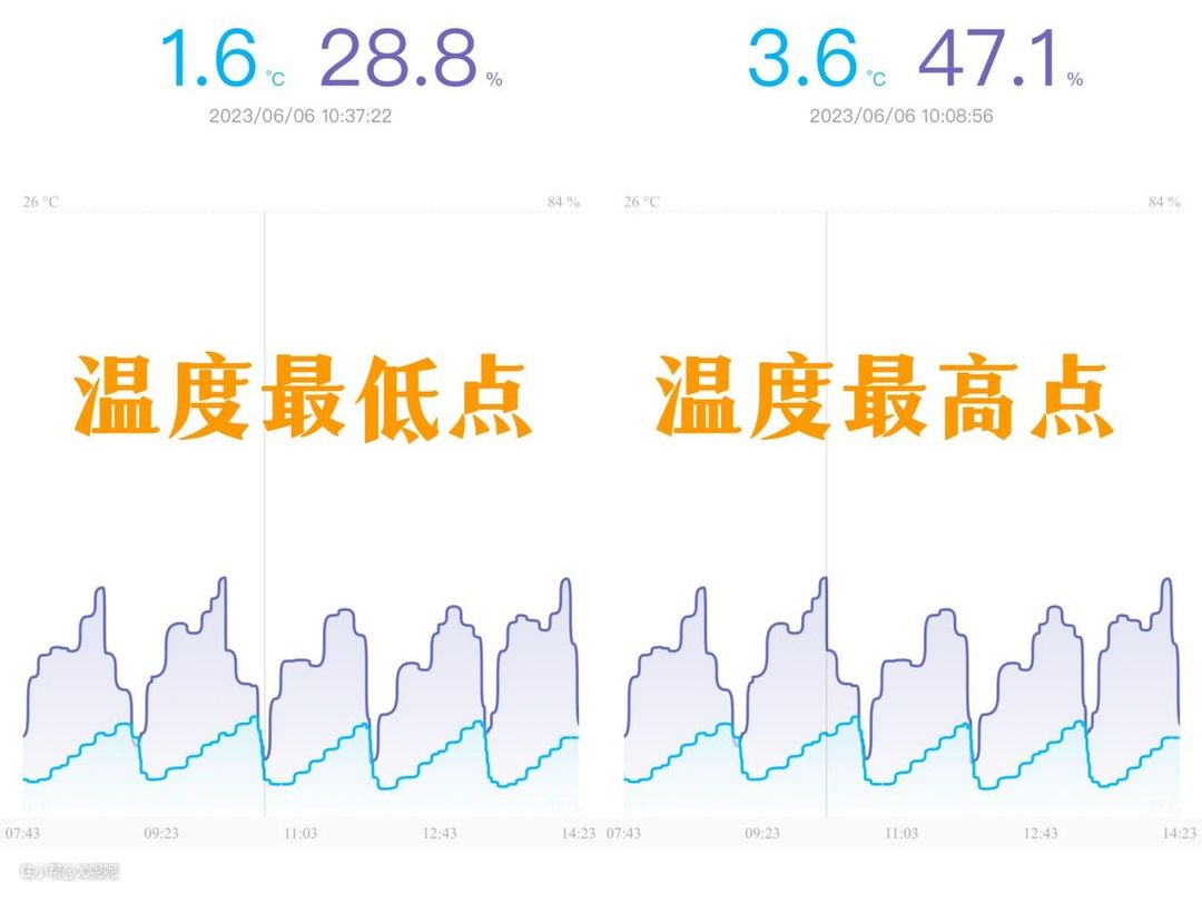 不过只是能调节还不够,温控是否稳定也很关键,为此我特意把温度设为了2℃,并把温湿度传感器放入了冰箱,可以看到冰箱内温度的最高点和最低点波动很小仅仅只有2℃的差距。