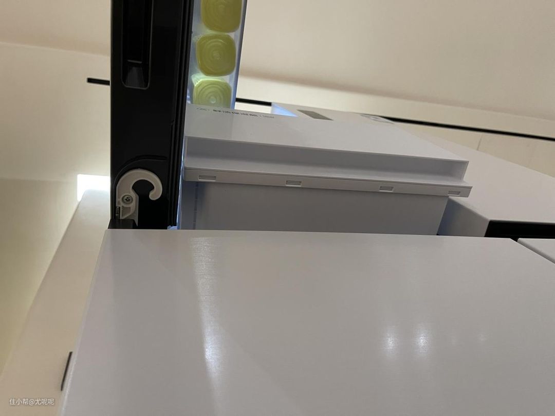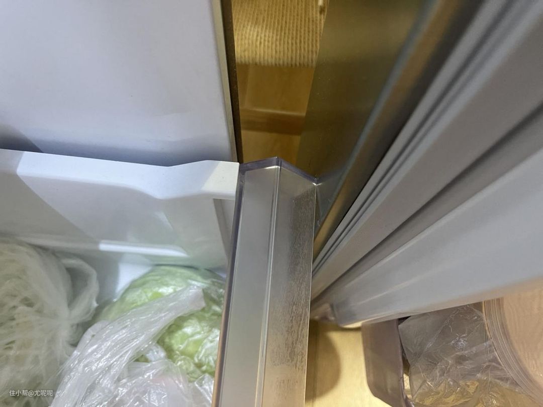 为了追求两侧平嵌,所以这款TCL T9冰箱专门设计了平嵌铰链,这样冰箱两侧即使有柜体或者墙体也不影响冰箱开门,可以看到柜门边档上一块柜体板后依然不会影响冰箱门的开启。