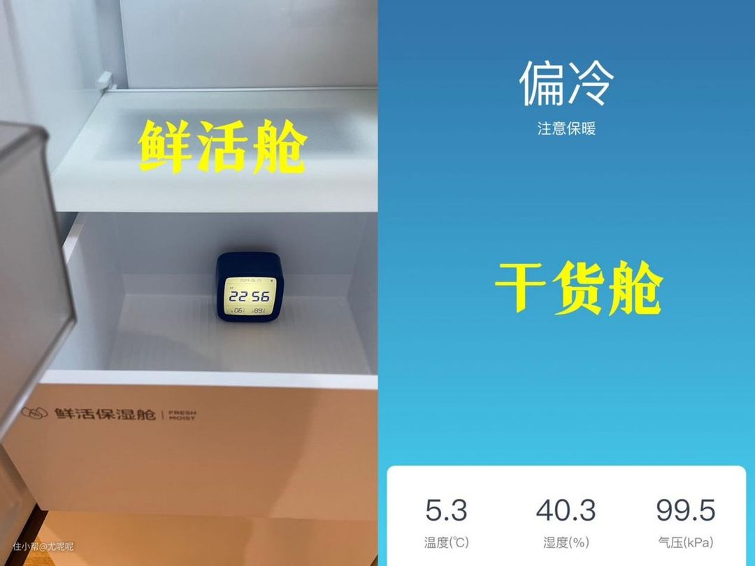 为此我特意用温湿度传感器对果蔬保湿区和珍品干货区进行了测试,可以看到两个抽屉的温度虽然差不多,但是湿度干货舱明显会低于鲜活保湿舱,因此一款优秀的冰箱不但温度可控,湿度也需要可控才能保证更多食材的专属存储需求。