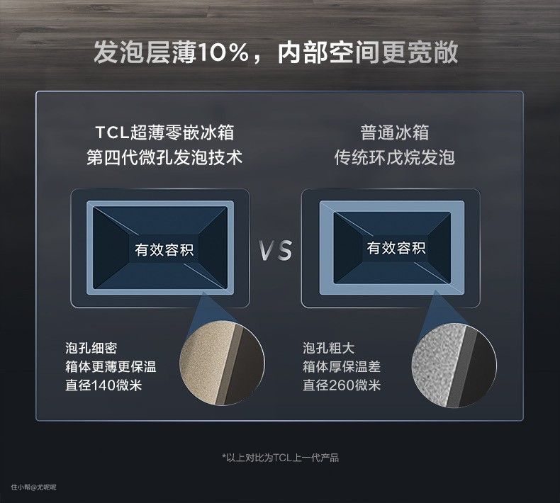 其实现在还有第三种选择,那就是把发泡层做薄,从而实现冰箱容量够大的同时厚度也可以做薄。TCL超薄零嵌冰箱就采用的这种方式,发泡为第四代微孔发泡技术,在保温效果一样的情况下,厚度可以做到比传统的环戊烷发泡更薄。
