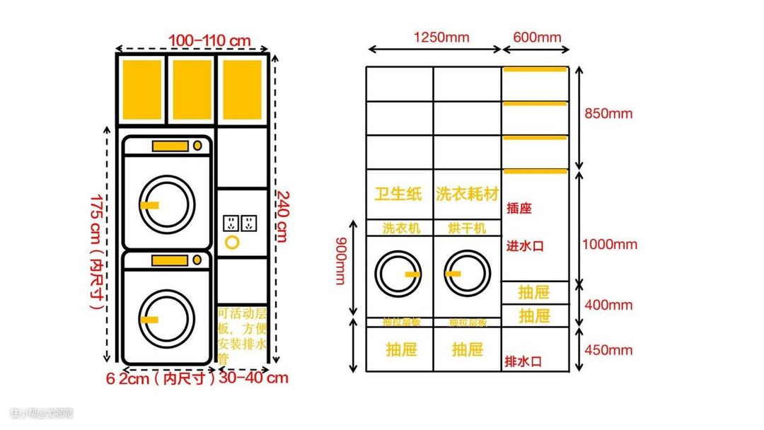熟悉我的朋友都知道我写过一本“装修常用数据手册”,在附录部分我特意整理了全屋电器的尺寸预留和水电预留的要点,其中洗碗机、蒸烤箱以及洗烘套装等产品都是有固定的一个尺寸。