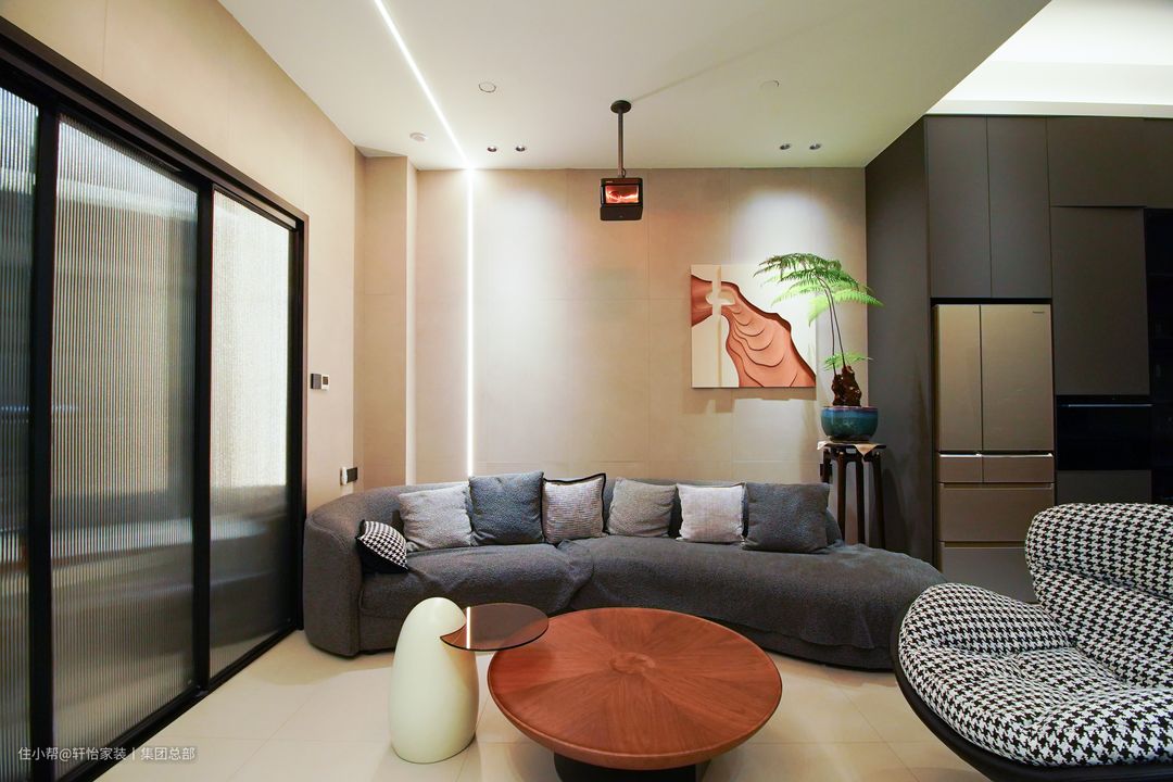 地下室客厅整体装修,在配色上多样又有层次感。墙面与地板采用米黄色系,搭配一张深灰色的异形沙发和一张千鸟格贵妃椅,组成围合布局,非常适合社交和商务洽谈。同时直接取消传统的电视机布局和主灯设计,做成投影功能,从光线环境和设计布局上都优先考虑了办公需求,非常贴心~