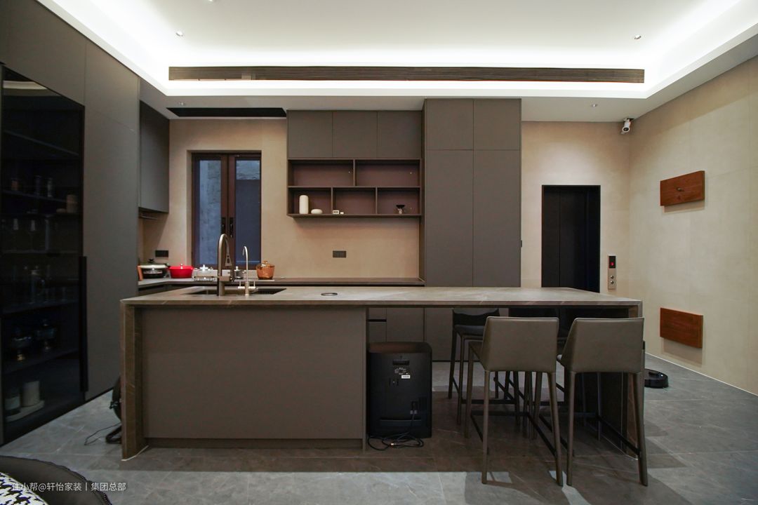 开放式的西厨空间主要以棕色为主调,L型操作台加入岛台,同时满足四人用餐,再取消主灯设计,仅用灯带做氛围烘托,让西厨空间设计更具氛围感。