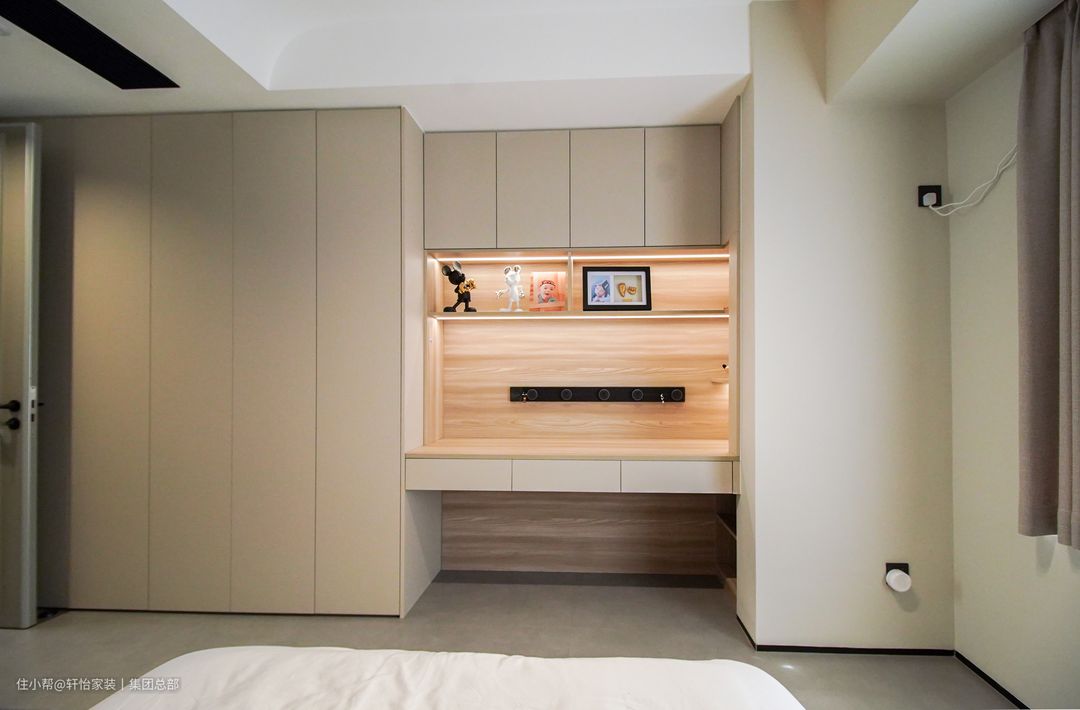 整屋最有利的户型结构就是每个房间都有一个大窗口,当然长辈房也不例外,采光条件得长好,搭配双层窗帘装饰,白天黑夜自由切换,满足生活需求。利用床尾空间,打造了整墙内嵌衣柜,黑色把手点缀其中,简约大气,更适用于适老房的设计。