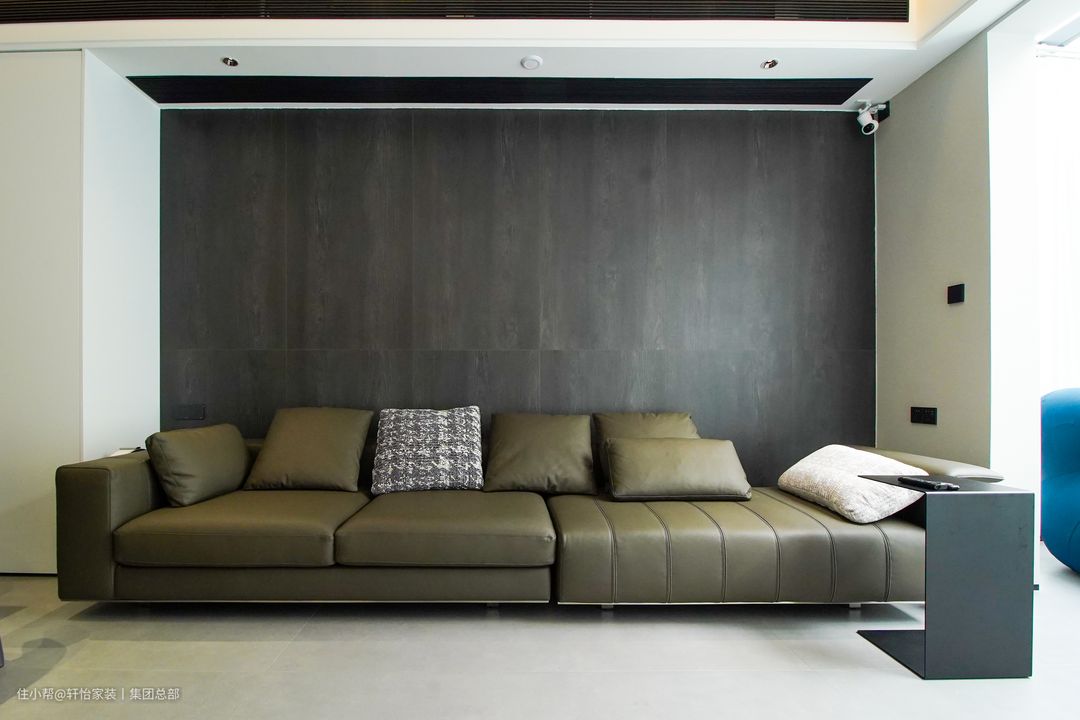 设计师利用客厅的墙体结构,定制布局了一张2M长的深绿色皮质沙发,与灰黑色的木饰面沙发背景墙相衬,简约大气且充满设计格调。