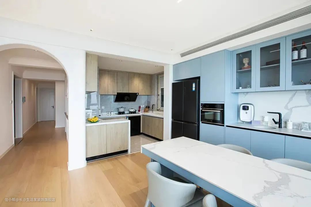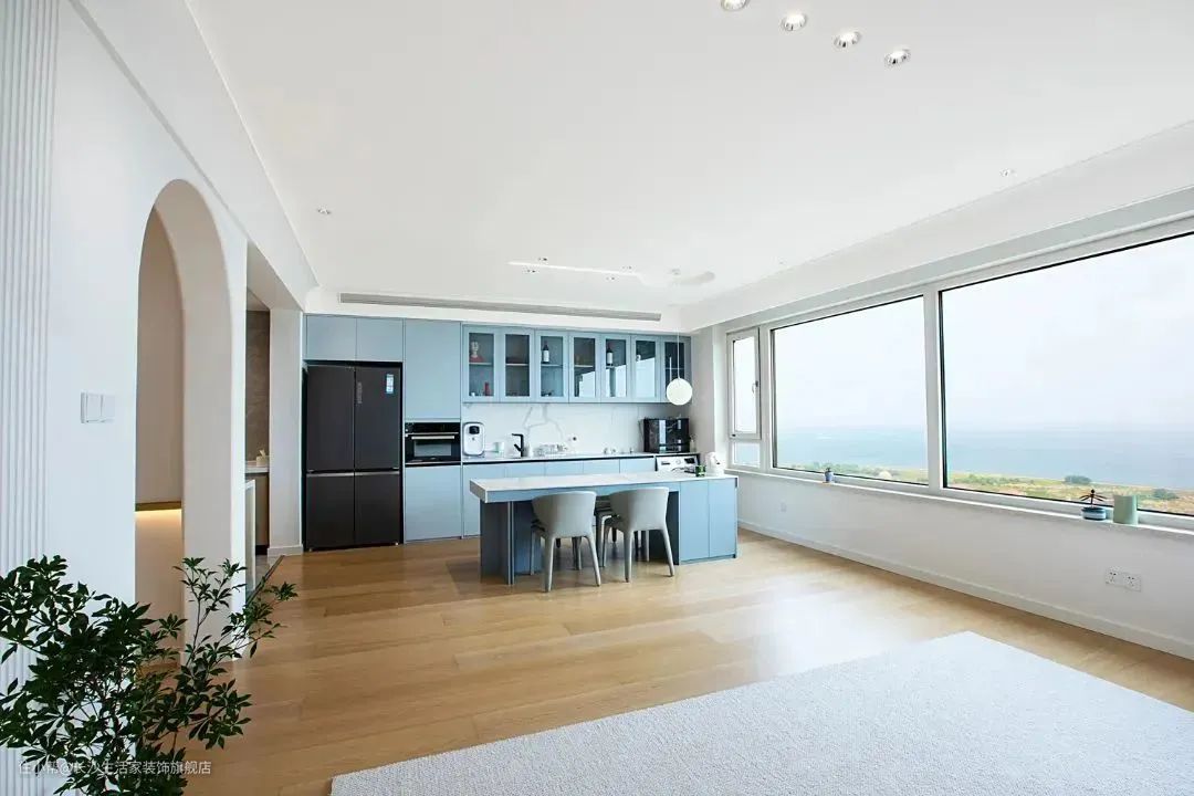 餐厨区域以简洁自然的原木色搭配清新的海蓝色,加上爵士白柔和过渡,整体清爽而温柔。海蓝色的餐厅,与窗外的海景相呼应,心之所向的慢节奏生活,未尝不是如此。