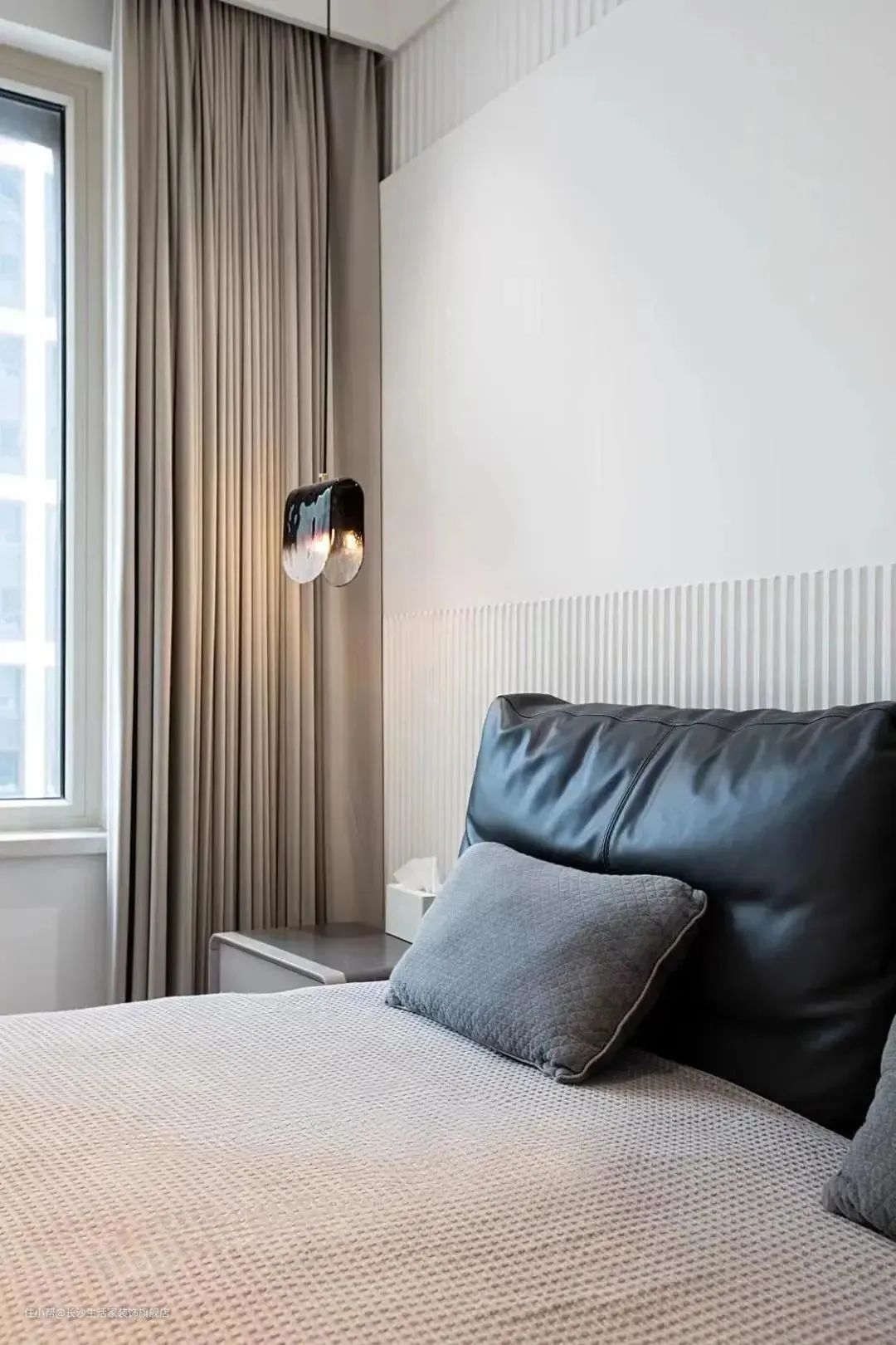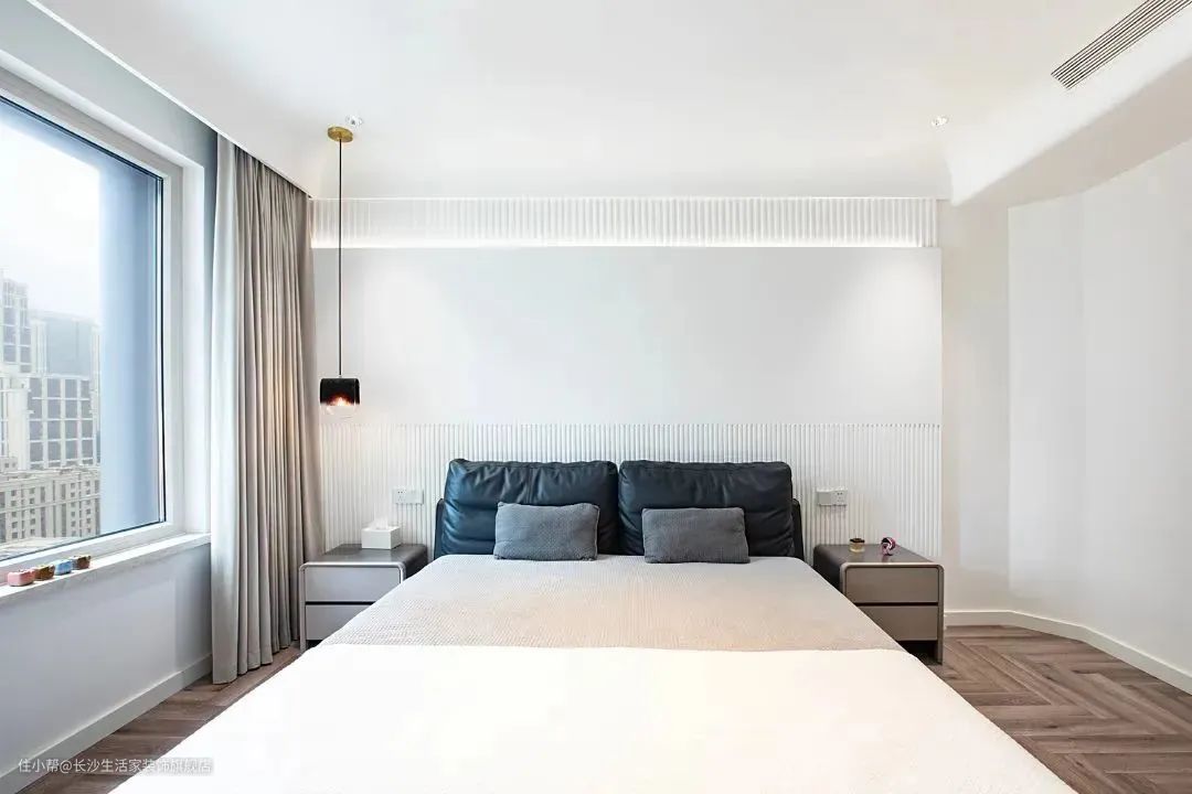 主卧原本采光充足,做无主灯设计,让整体空间更加简洁。弧形吊顶,让空间更柔和,床头墙面利用石膏线条拉伸空间,搭配灯带和创意床头吊灯,视觉上更有层次感。
