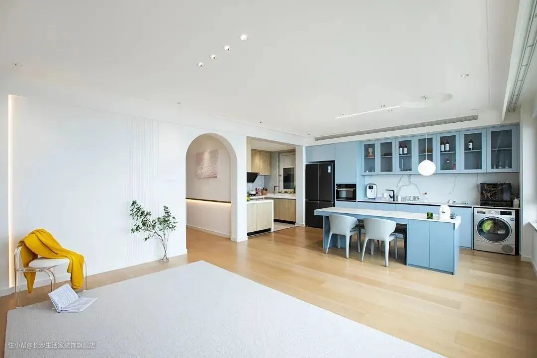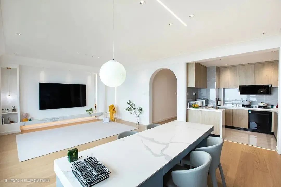 全屋以白色为主调,搭配木饰、岩板等点缀,奠定简约、自然的空间基调,搭配木色、海蓝色、石材、绿植等,打造自然、宁静的家居环境。同时,运用直线和弧线石膏造景,增加空间层次感,在部分空间利用线性灯拉伸视觉,营造广阔的空间氛围。