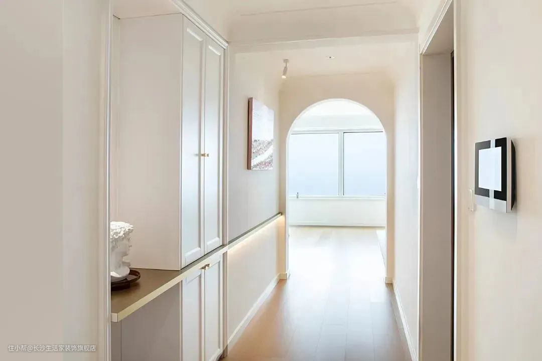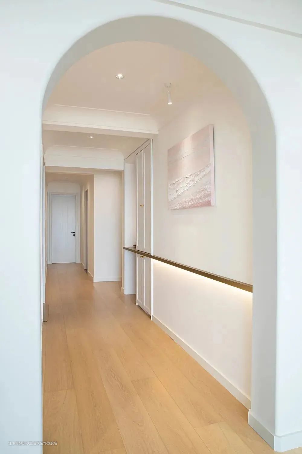 入户到客厅有一段走廊,设计师运用弧形门顶打造拱廊,营造推门入室的仪式感。