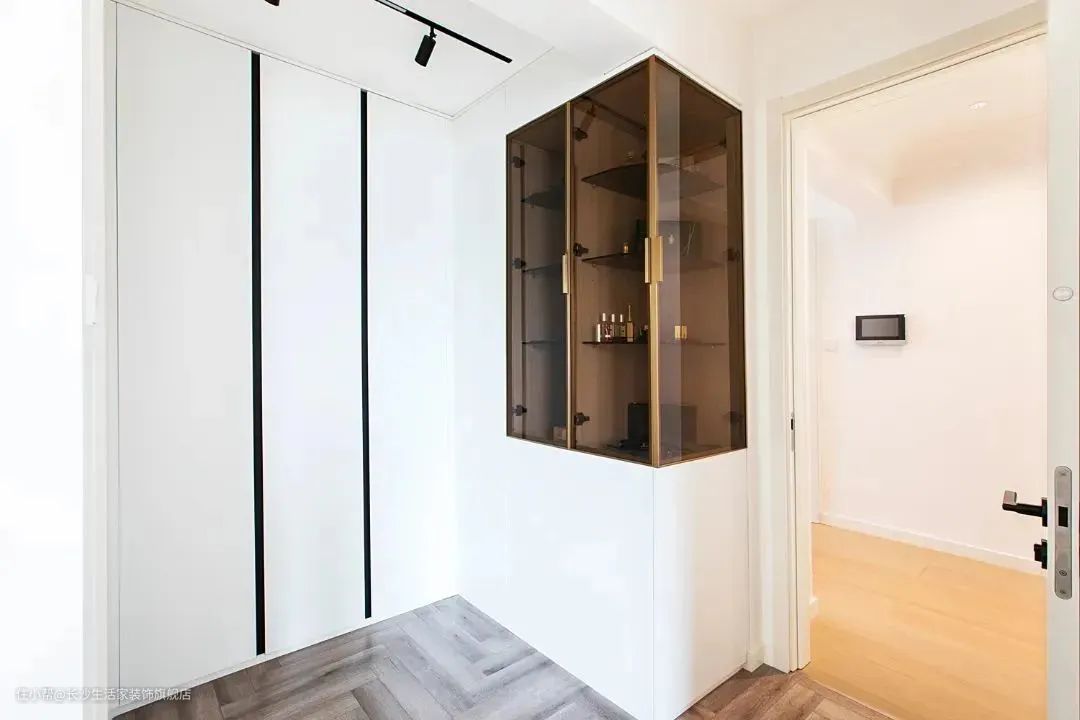 拱廊的另一头,便是主卧,进门是一处半开放式衣帽间,由茶色透明储物区与隐藏式储物空间组成。
