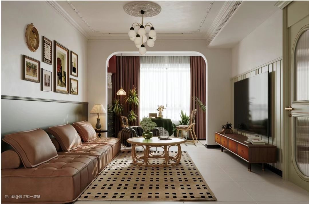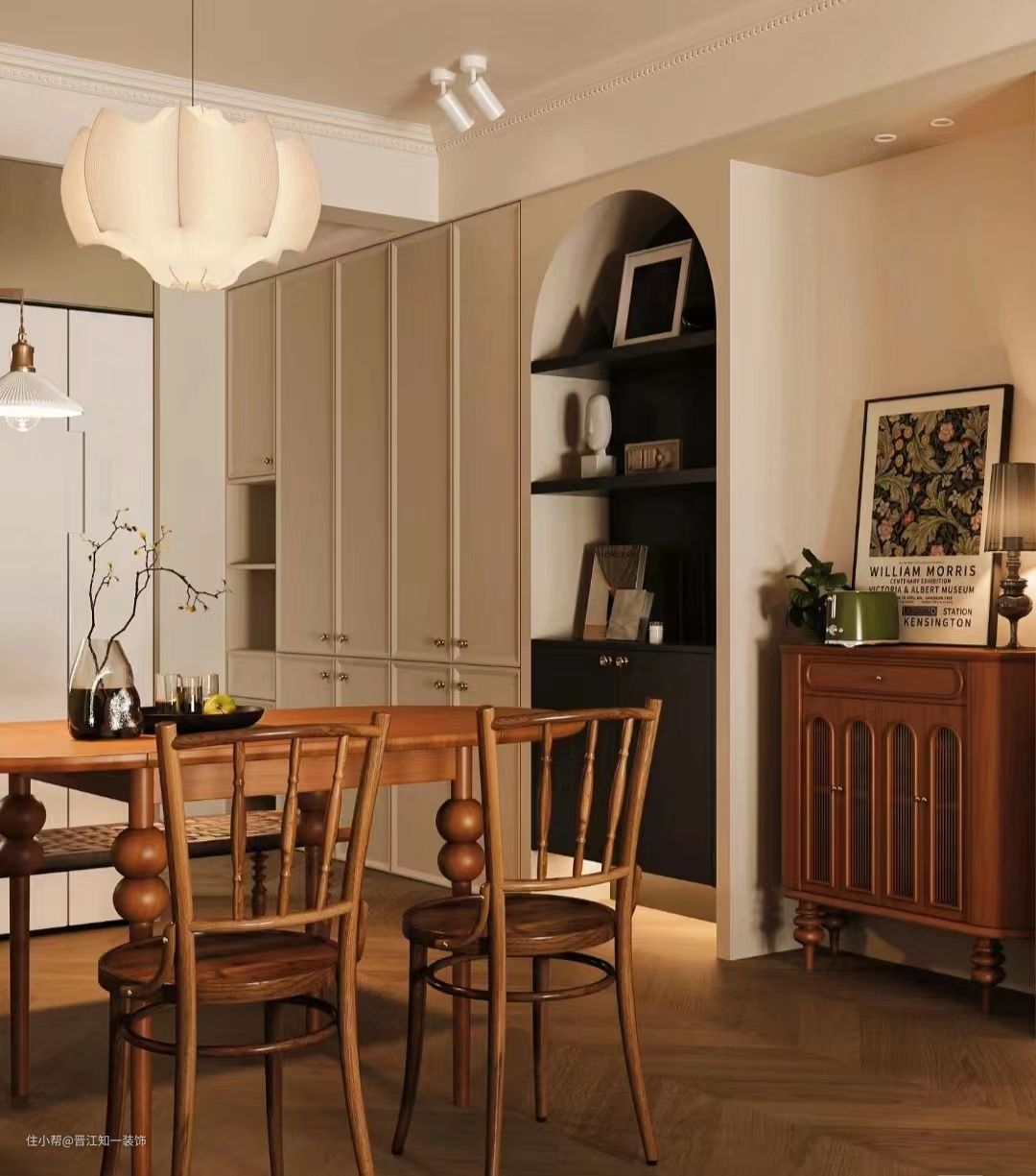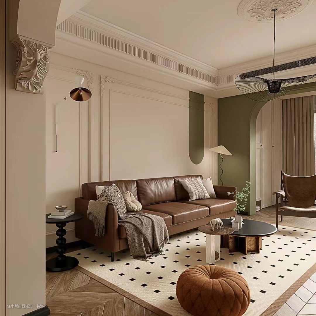 1.整体的配色。以大地色系为主,黑色、复古色系(就是哑光的,比如复古红、复古绿)做点缀,整体的配色柔和,不适合搭配高纯度的艳丽色彩。地面可以选择胡桃木的木地板,人字型铺开,或是木纹砖,或是灰米色哑光砖,或是大地色系的柔光砖。搭配亮光砖是非常违和的,与奶油风、原木风不同,法式复古风整体都是哑光色调,突然加入大面积的亮面,十分突兀,就是大型的翻车现场。墙面颜色可以选择可可蛋奶、杏子灰、珍珠白、汝窑、奶咖、米褐、可可糖、布林肯棕,造型上搭配法式元素的PU线条角花,氛围感拉满。喜欢凸出个性,可以选择在沙发、床头、玄关、餐厅的背景墙使用复古红、复古绿选择性涂刷(这里涂刷是需要搭配技巧的,稍有不慎用力过猛就翻车了,会有种莫名的廉价感。)