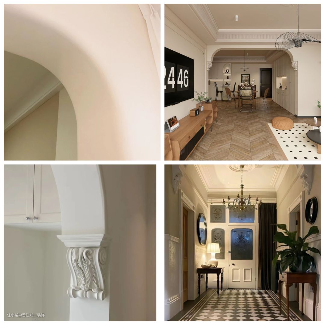 ①门洞需要做拱形处理,一定做标准的半圆(只是单纯做拱形,会有种廉价的违和感),阳角可以做一些小圆角,避免生硬的处理,比较大的垭口可以加梁托,法式氛围会非常浓郁。