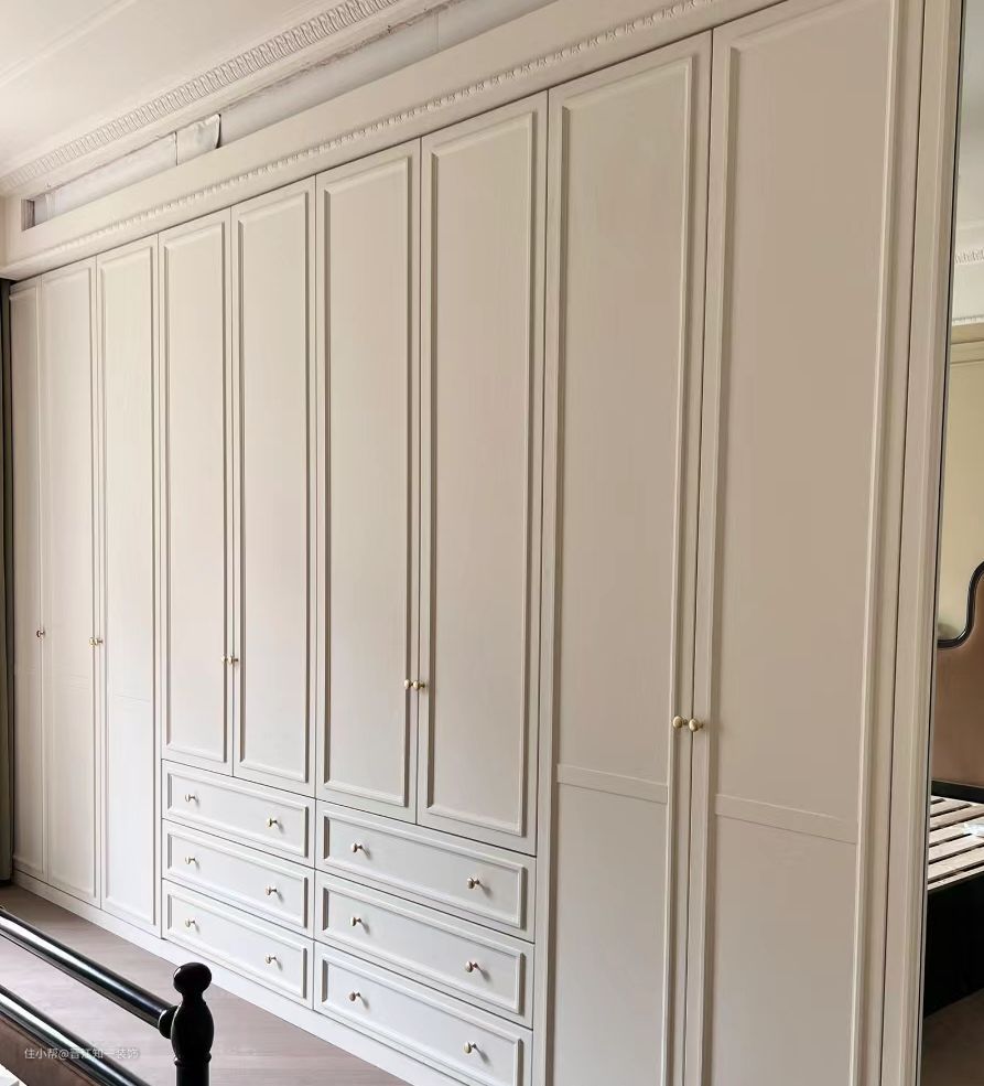 ③定制柜可以做整面封顶,柜子的拉手可以用亮金色、黑色的小圆拉手来做点缀。