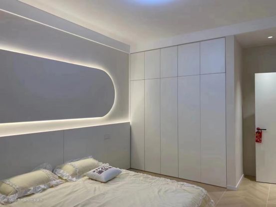 卧室空间采用暖白色调作为空间主色调,床上用品采用浅黄色作为空间的点缀进入屋主人的眼帘,给人视觉带来舒适的感觉。床头背景墙椭圆造型极具特点加上灯带,营造舒适温馨的睡眠氛围。