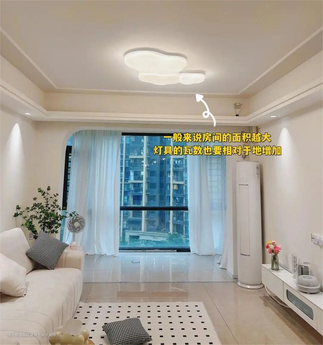 以一间20平的客厅为例,按照面积的五倍来计算,所需要的灯具总瓦数就是100w,需要配置一个36w的大吸顶灯+6-8个射灯。