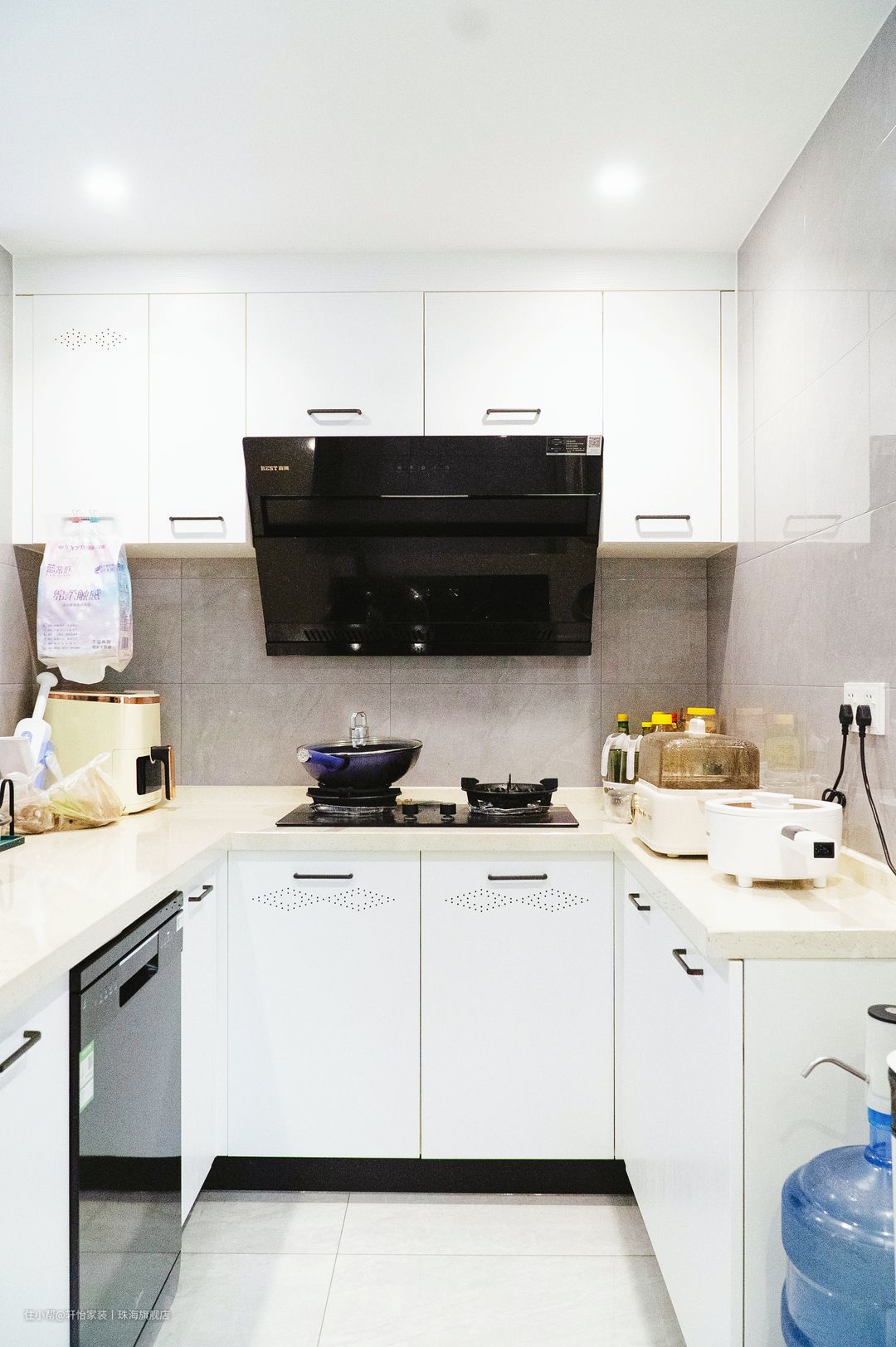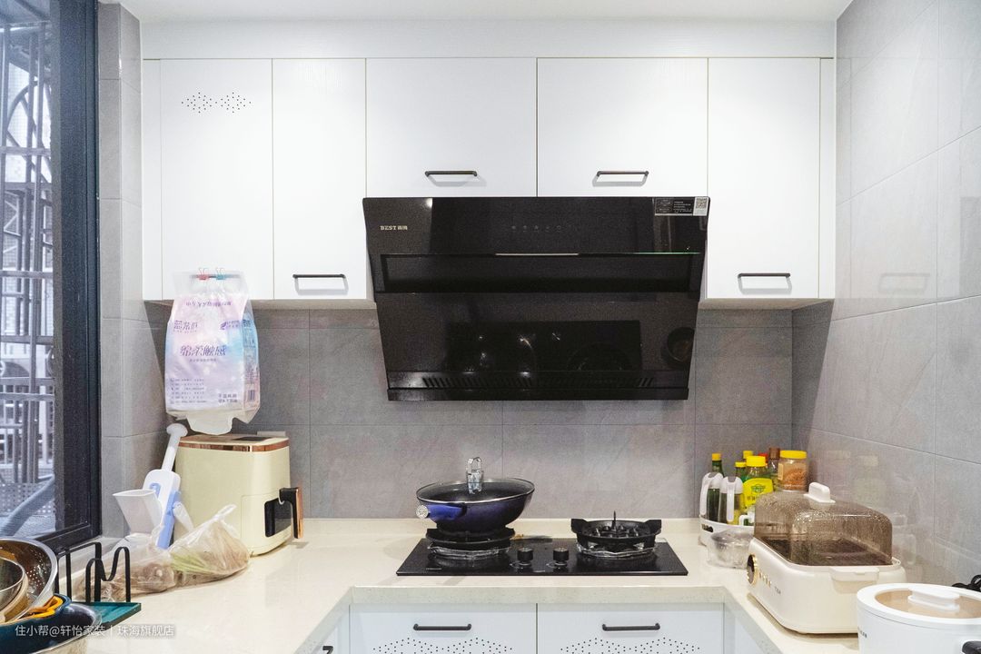 橱柜配色延续开放空间,很出彩,高级又时尚,让下厨心情都变得愉悦。定制的U型橱柜,让清、切、煮下厨动线一气呵成,也大大满足了锅碗瓢盆的收纳,美观又实用。