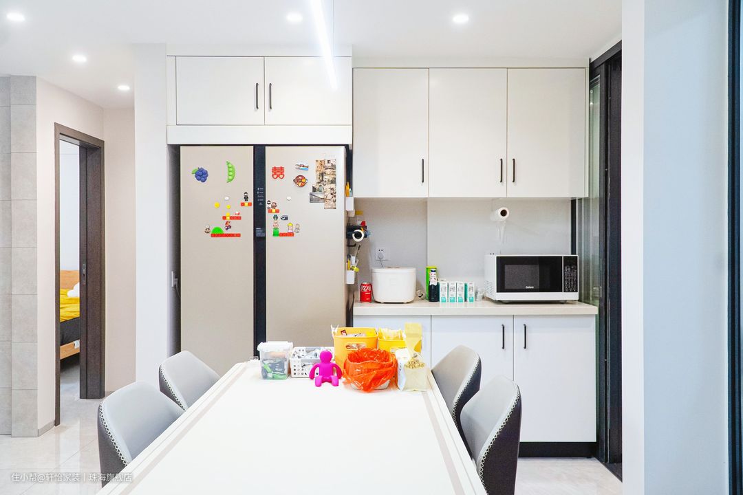 沿墙打造的通顶餐边柜,冰箱做嵌入式处理,释放更多活动空间,柜子中部做了镂空