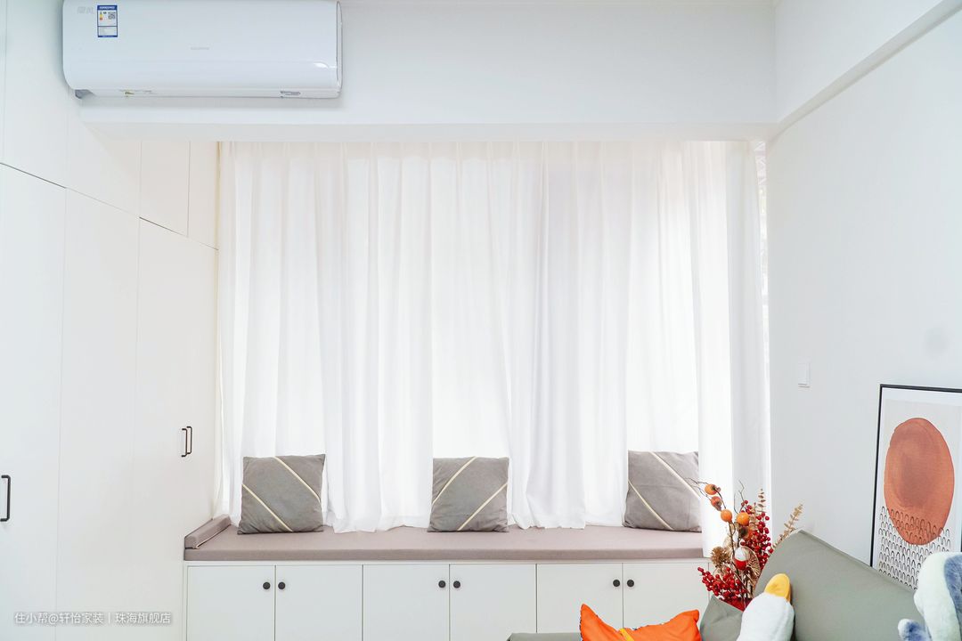 客厅开间过窄,只能摆放三人位沙发,不利于空间社交属性的发挥,设计师巧妙利用空间,将打通后的阳台,沿窗打造卡座+收纳柜,休闲,社交、整理三不误。纱帘飘飘,光线朦胧,在这里可以惬意放松,享受身心抚慰。