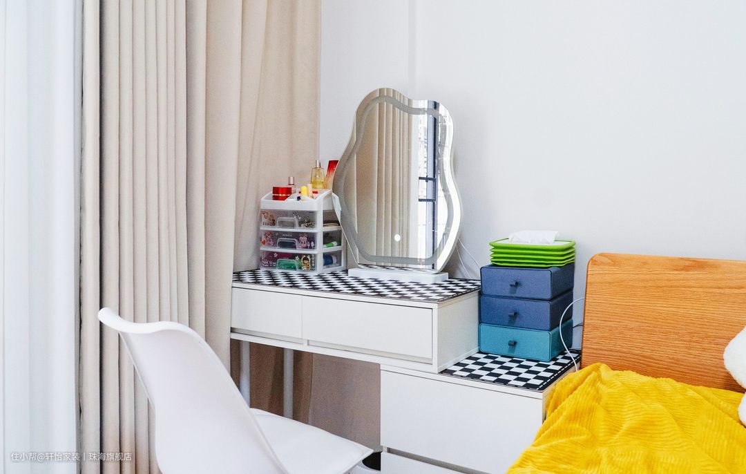 ins风北欧梳妆台,造型简雅又现代,搭配黑白棋盘格桌垫,显得精致又有档次。