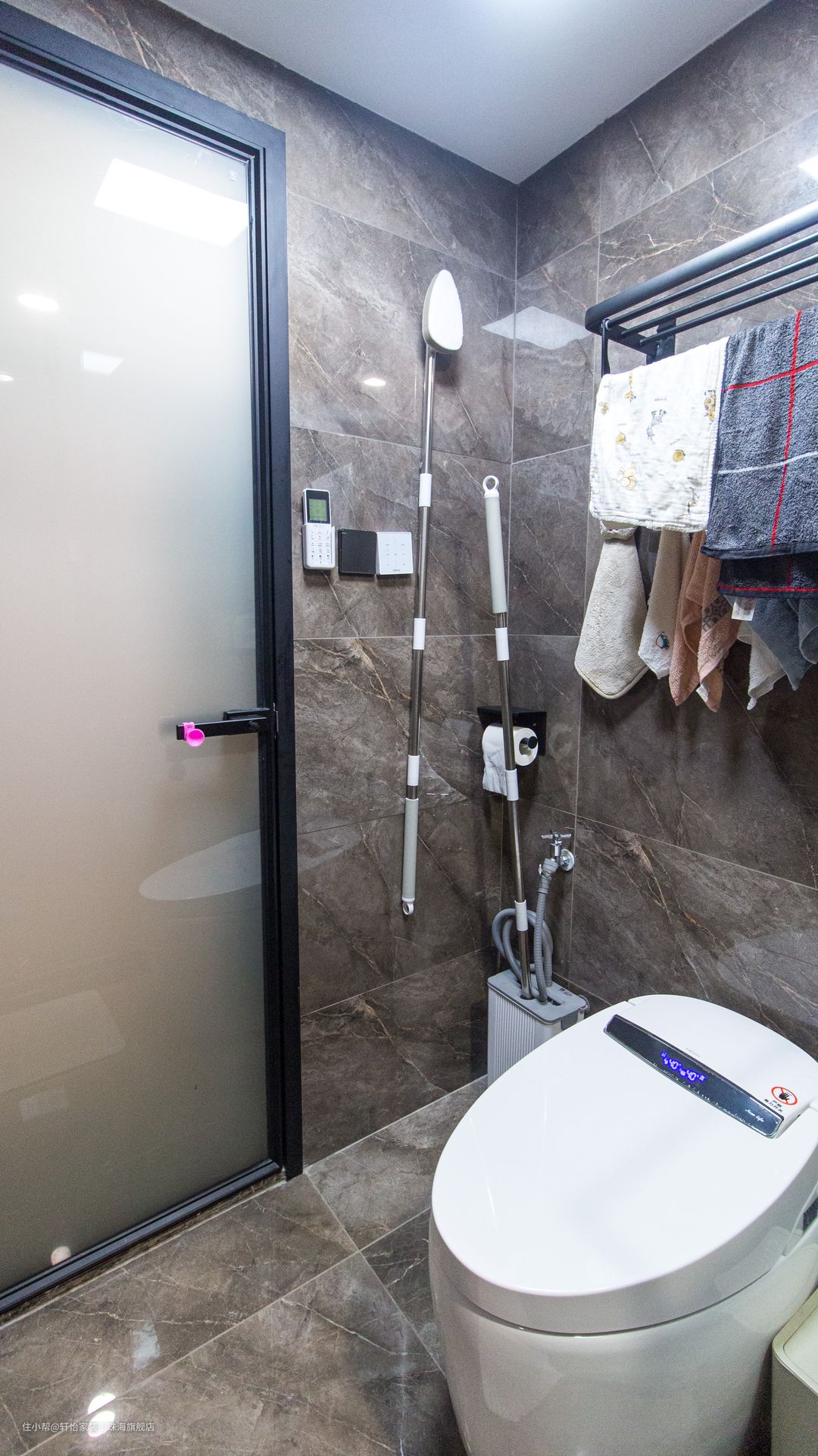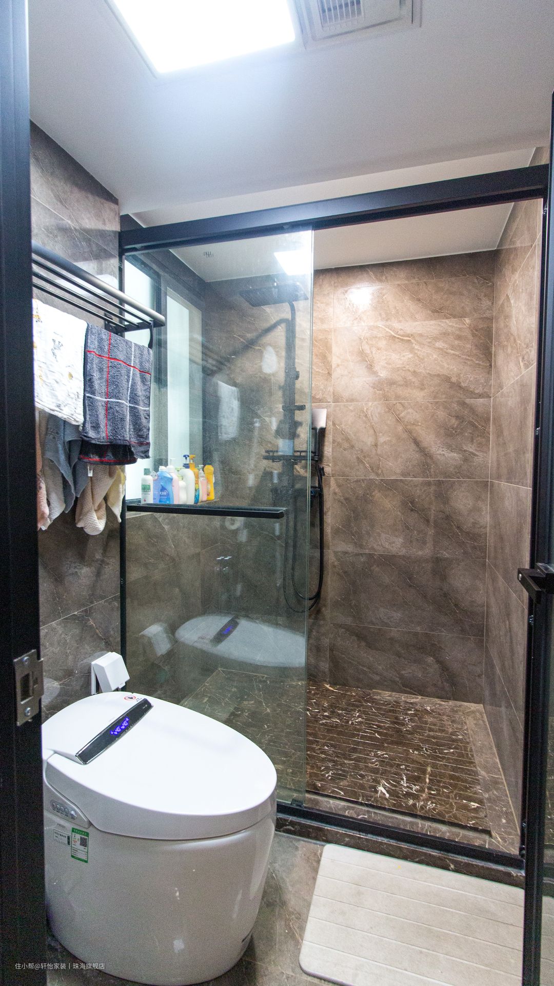 马桶和淋浴区用玻璃推拉门形式进行隔断,避免水流外溅,保持干区干燥。