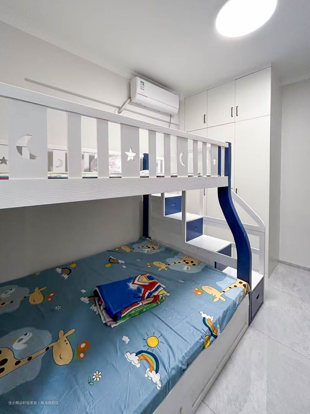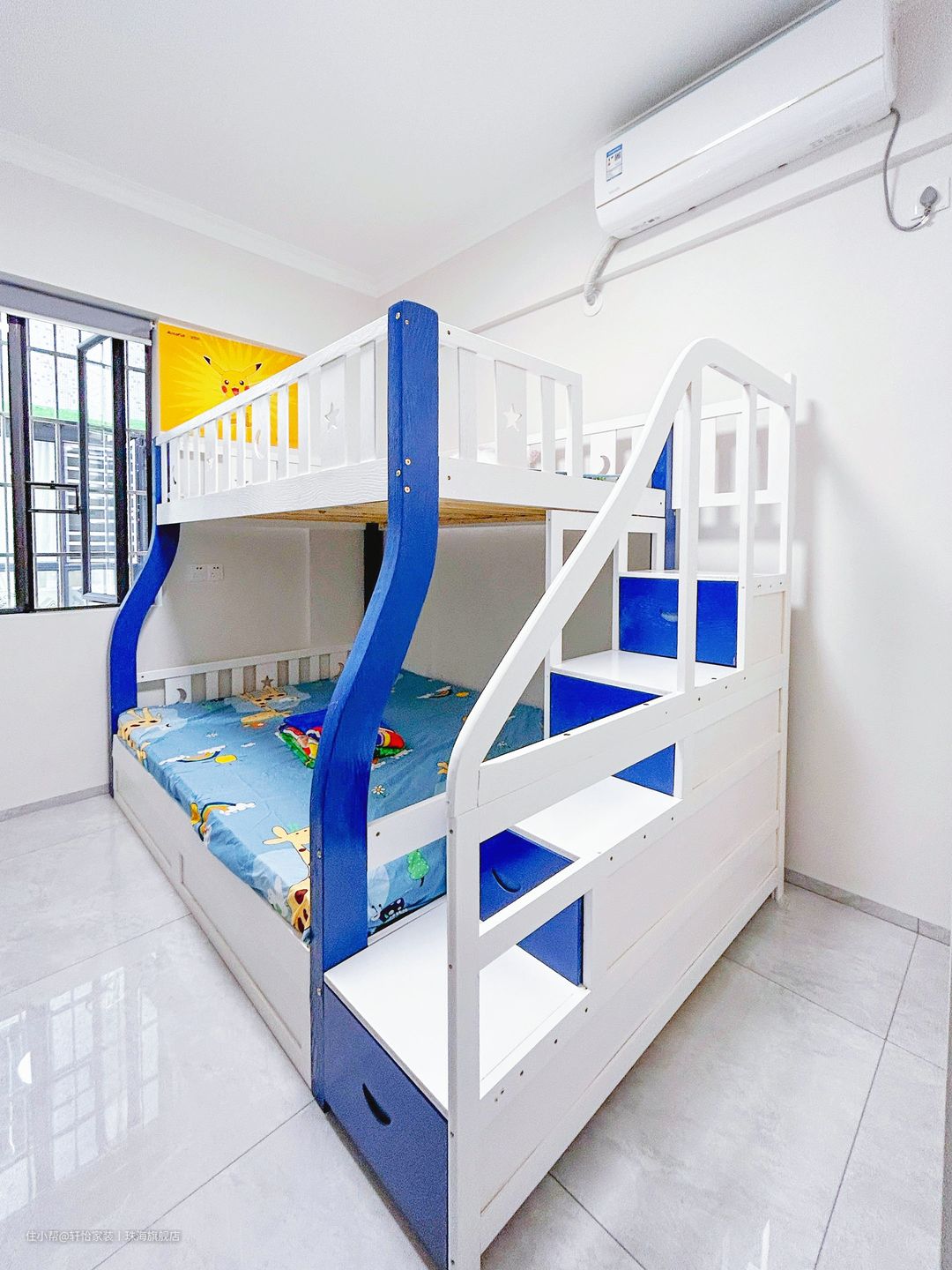 儿童房采用上下床设计,保障孩子的安全的同时,满足独立睡眠+收纳的功能蓝色床柱,给空间增添一抹亮色,让童趣相伴成长。