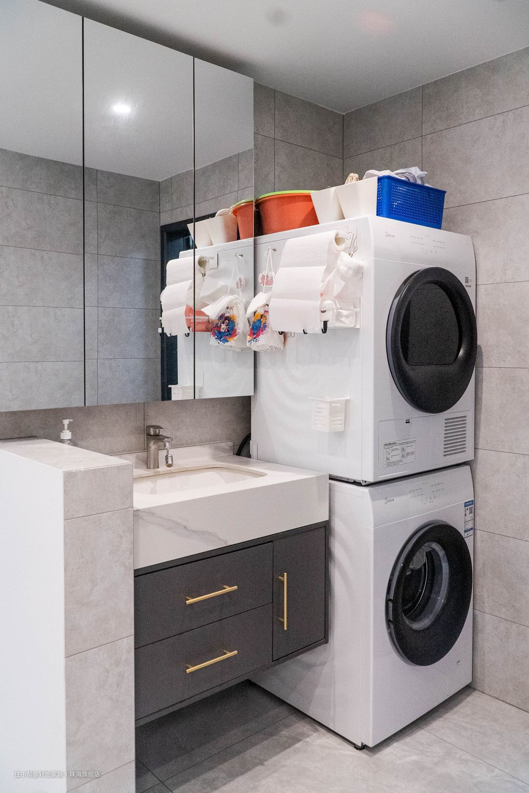 洗面台处拆除原有隔墙,采用半墙隔断,让出空间给过道,加之大面积镜柜,消解视觉狭长。改成洗漱台外置,干区湿区分开更显清爽,在墙角嵌入洗衣机+烘干机,提升空间利用率。