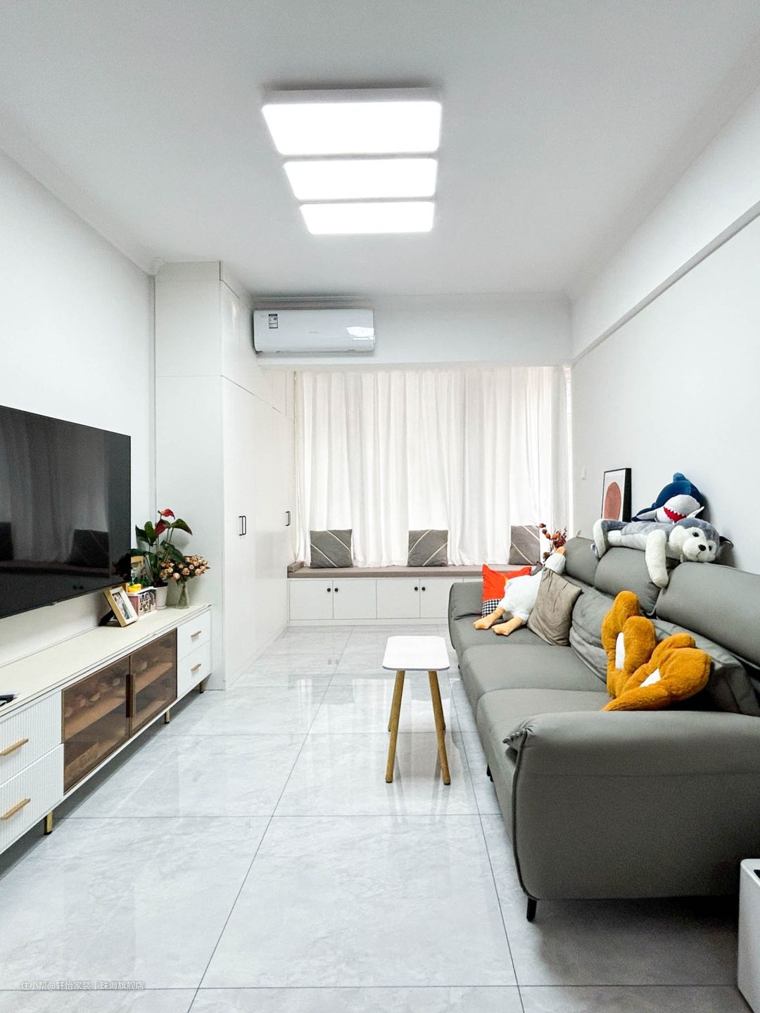 客厅采用大面积的白色做主调,搭配浅灰线纹瓷砖,用色温馨舒适。选用一字型电视柜
