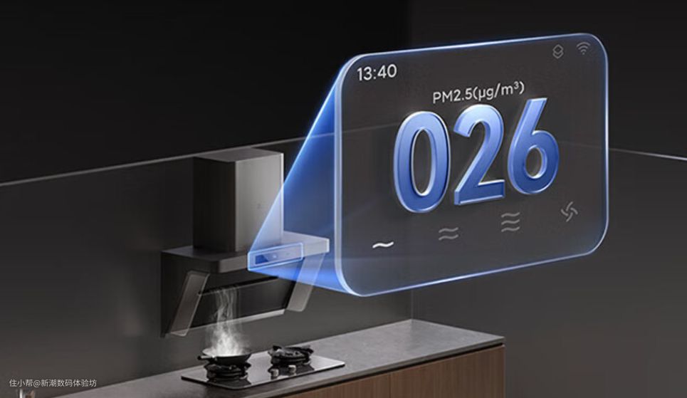 内置空气净化器同款PM2.5传感器,可以实时监测烹饪空气质量,机身屏幕会实时显示PM2.5数据。想不到吧,这年头出了能净化空气的烟机。